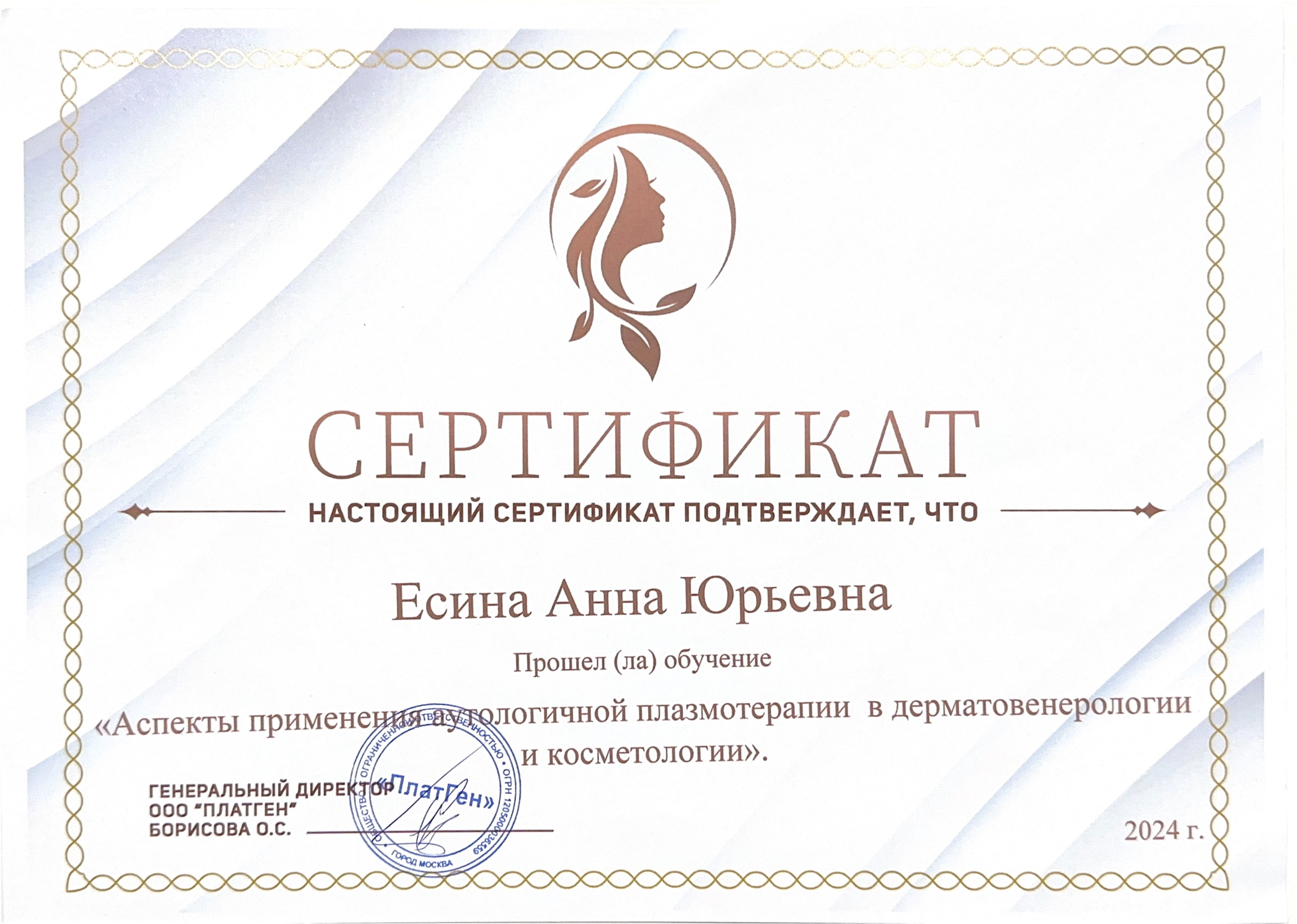 Сертификат специалиста-дерматовенеролога , косметолога продлено в 2010 году (действителен до 2020 года)