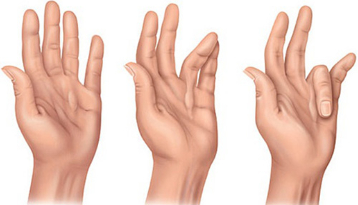 - IV — контрактура. Палец находится в согнутом положении. В окружающих соединительнотканных структурах и суставах происходят необратимые дегенеративно-дистрофические изменения.