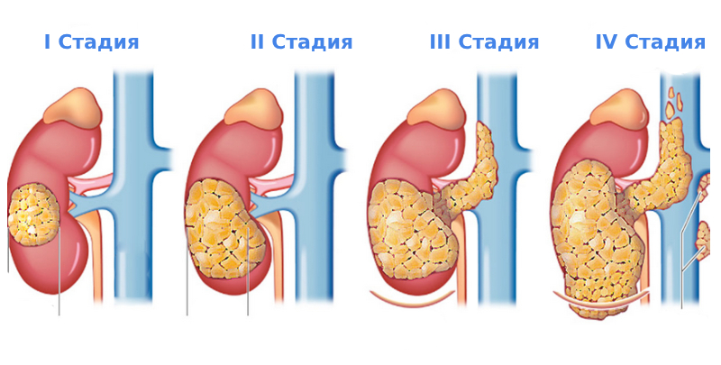 Используя приведенный перечень признаков, выделяют 4 стадии рака почки: