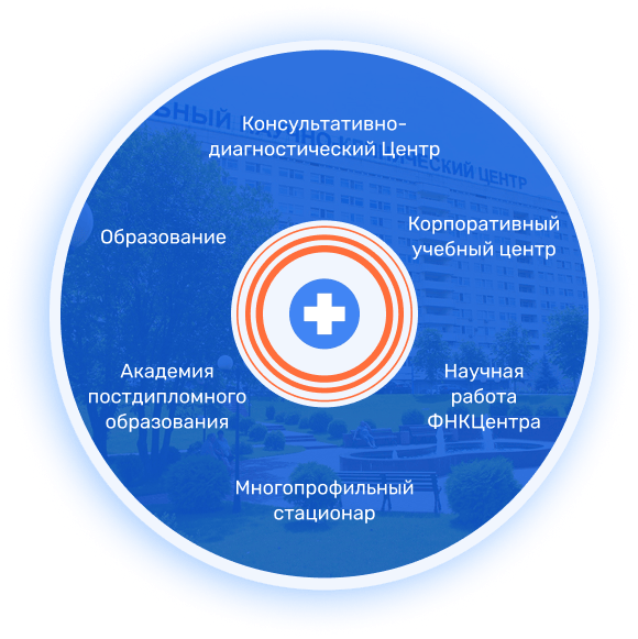ФНКЦ ФМБА России — Центр, объединяющий многопрофильный стационар, консультативно-диагностический Центр, научно-исследовательские лаборатории и Академию постдипломного образования.