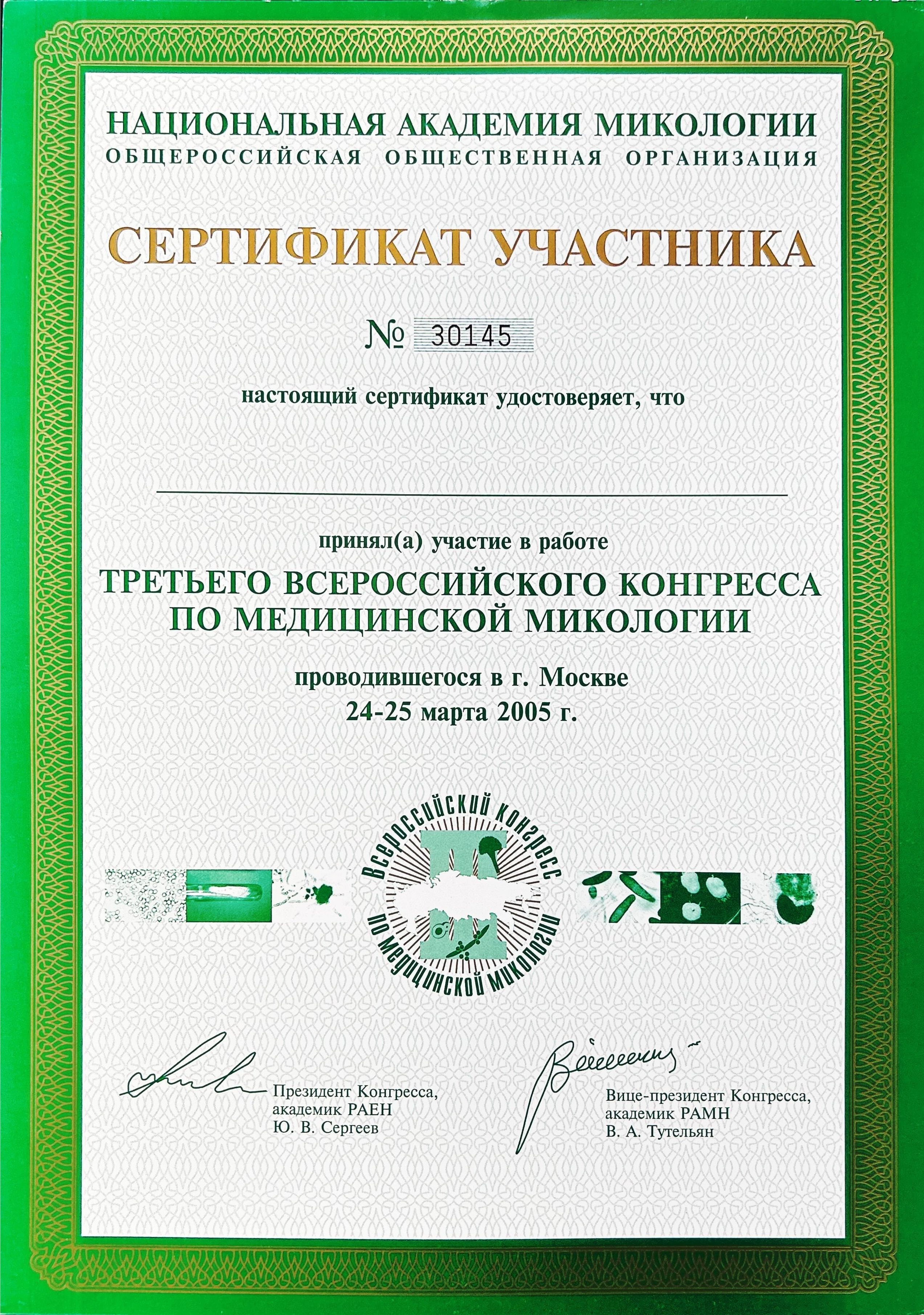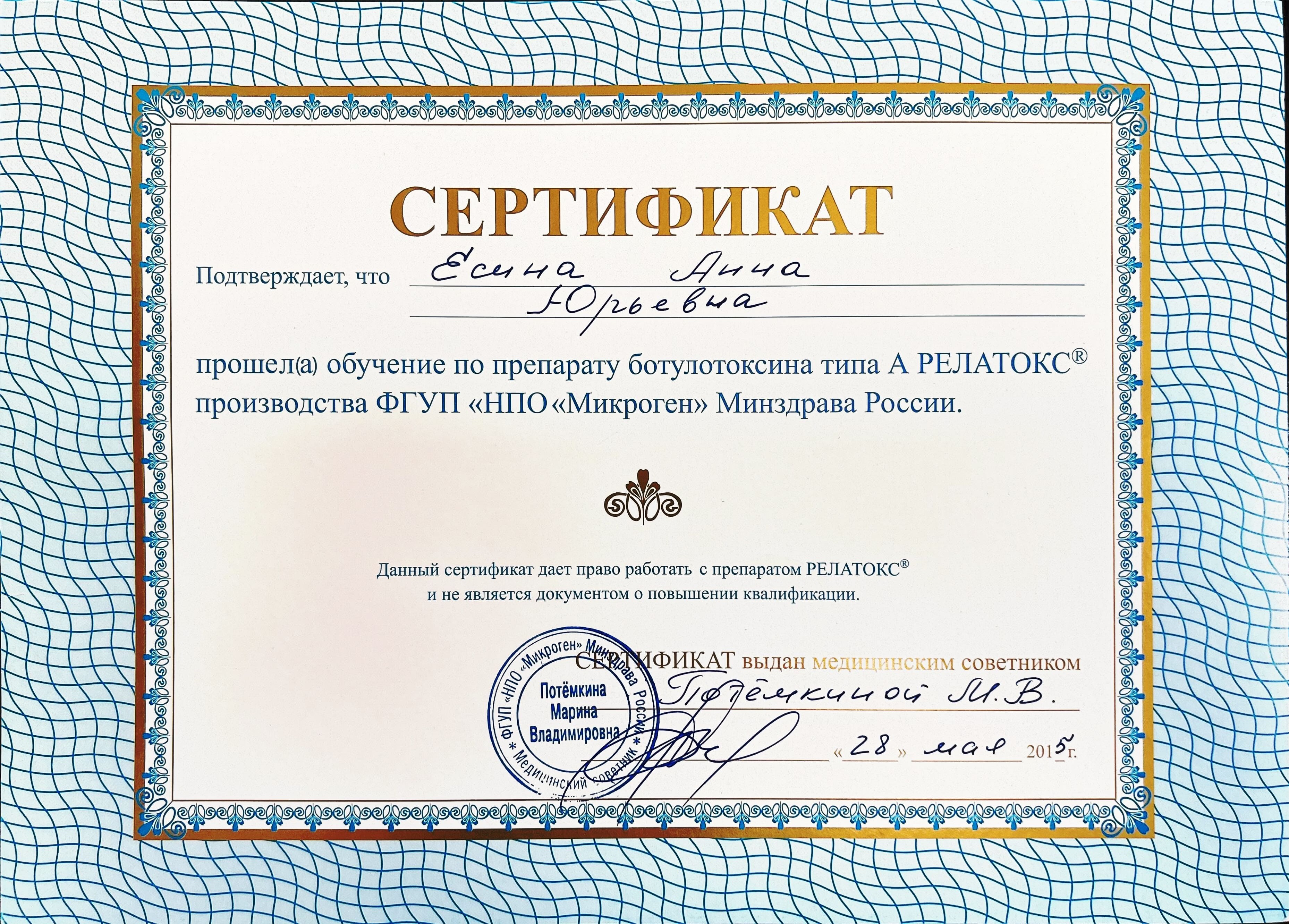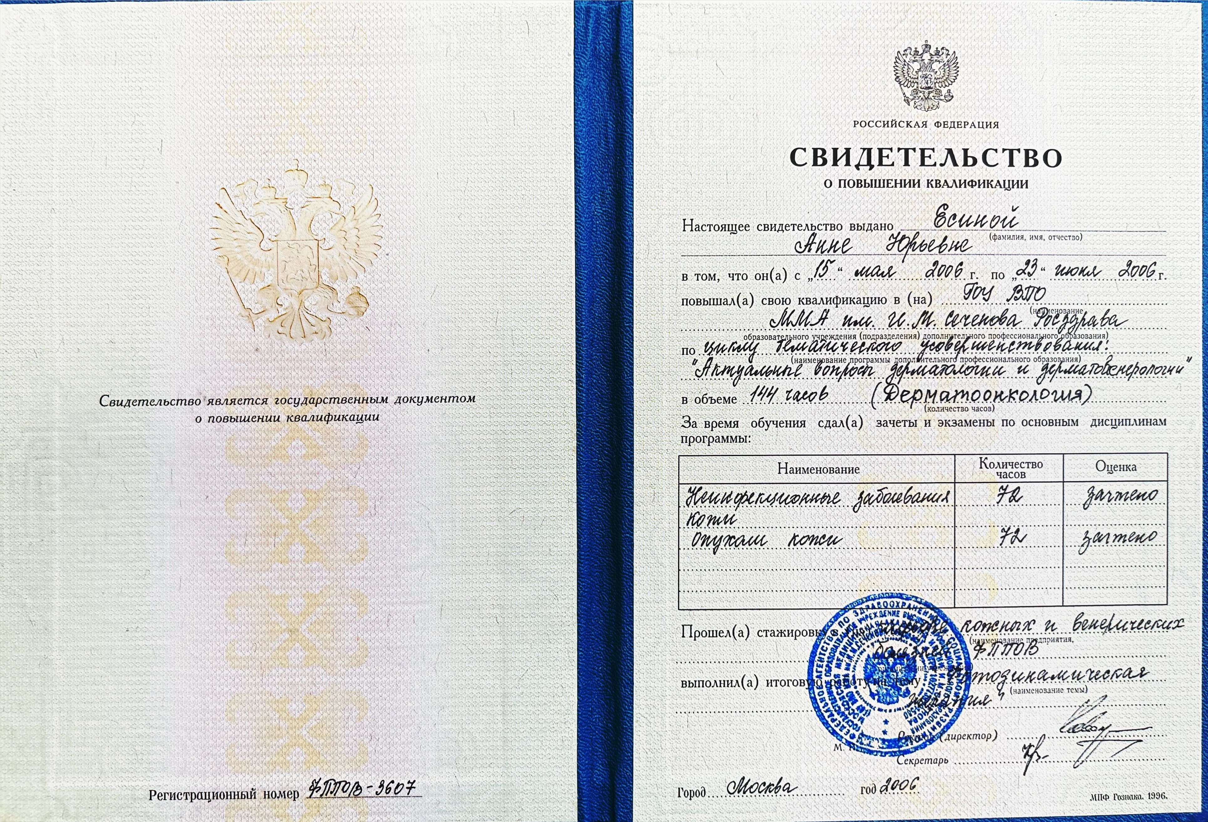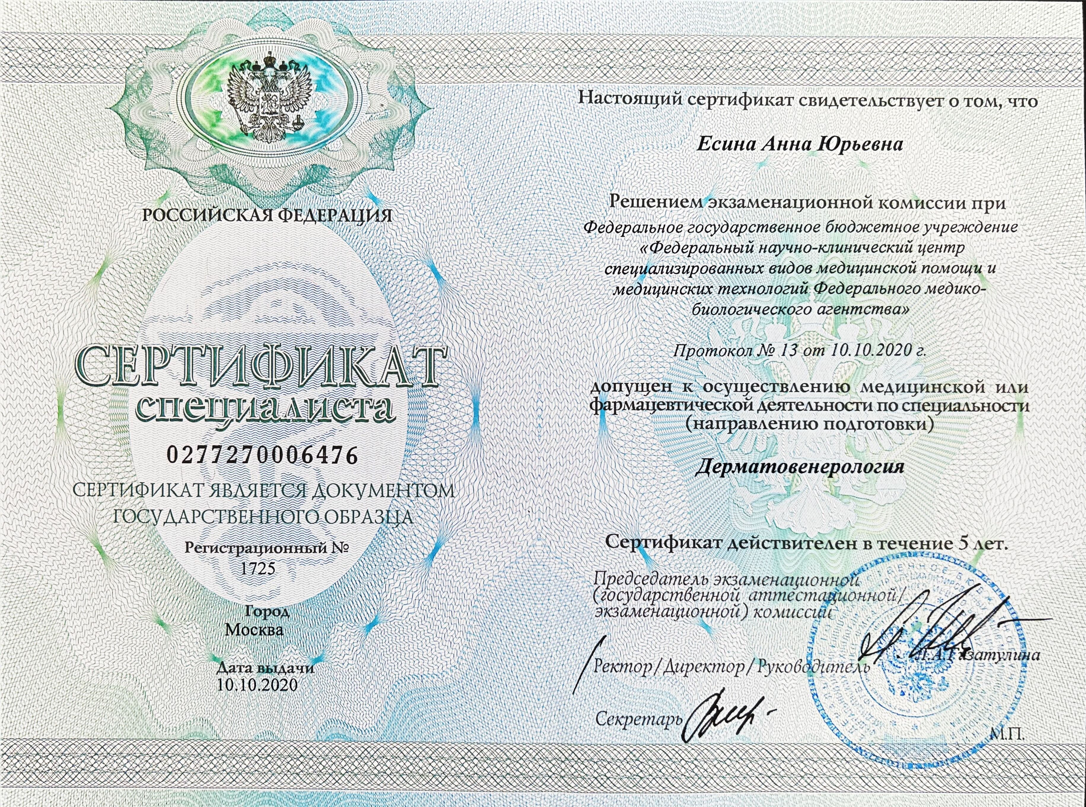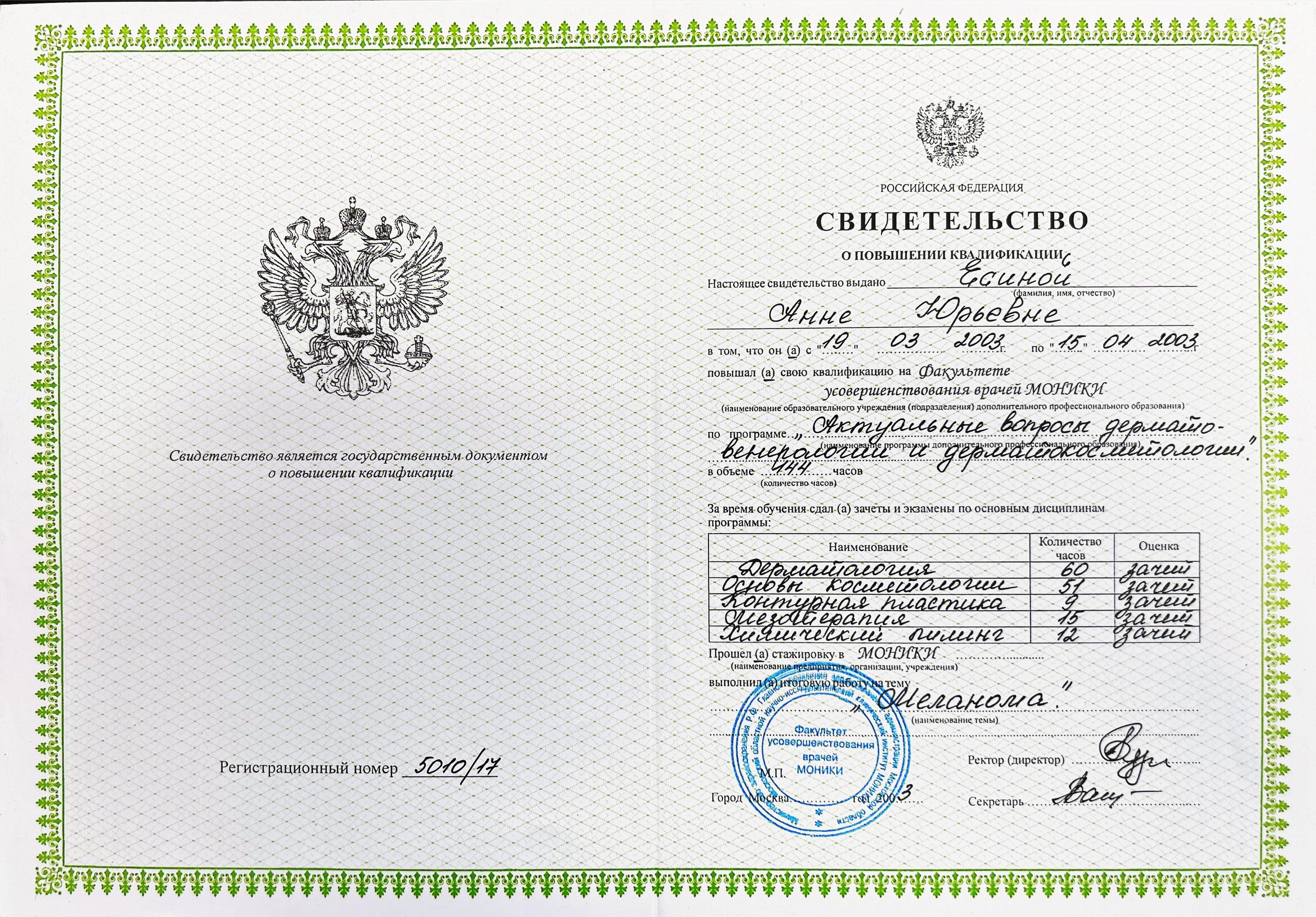 Сертификат специалиста-дерматовенеролога , косметолога продлено в 2010 году (действителен до 2020 года)