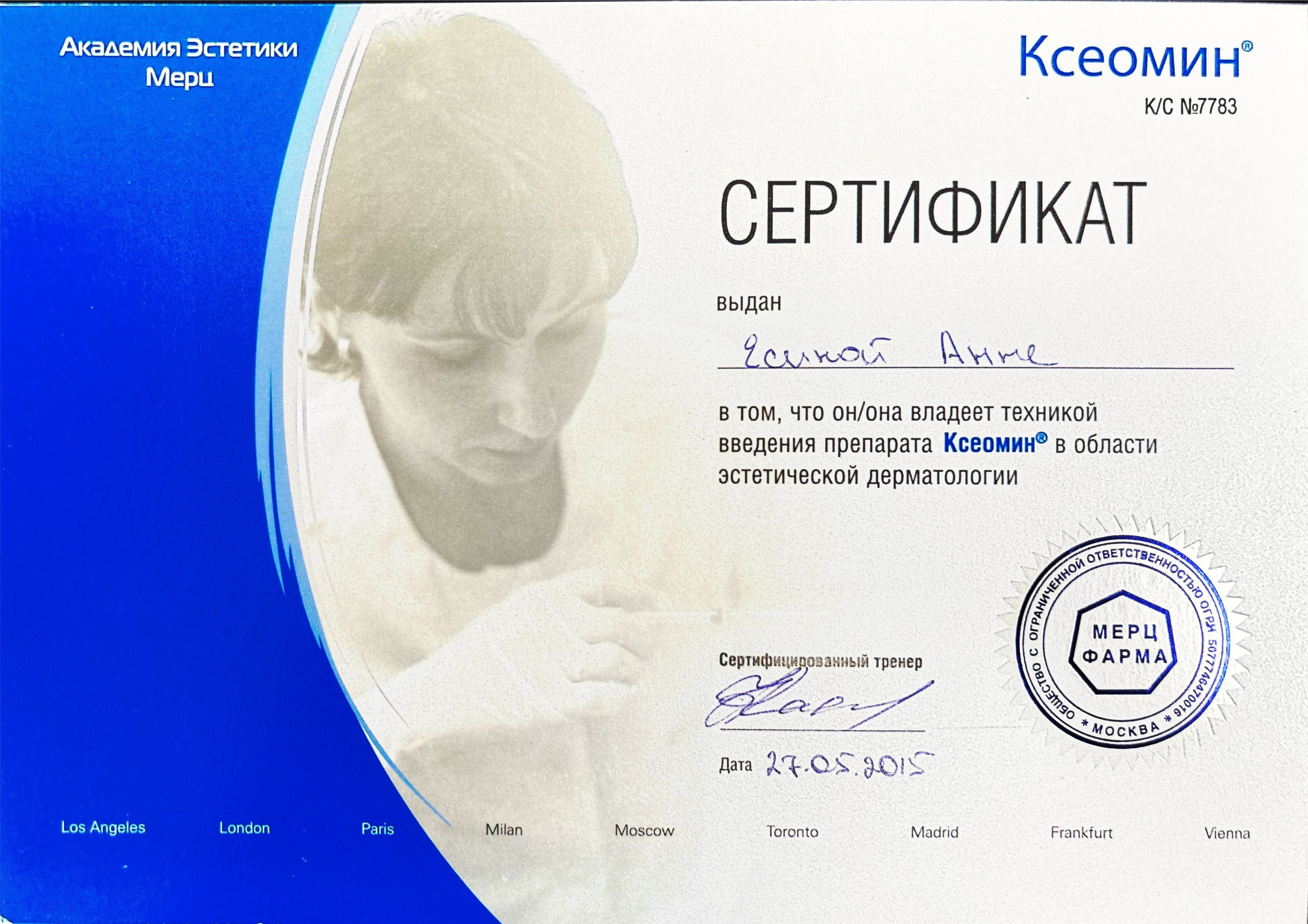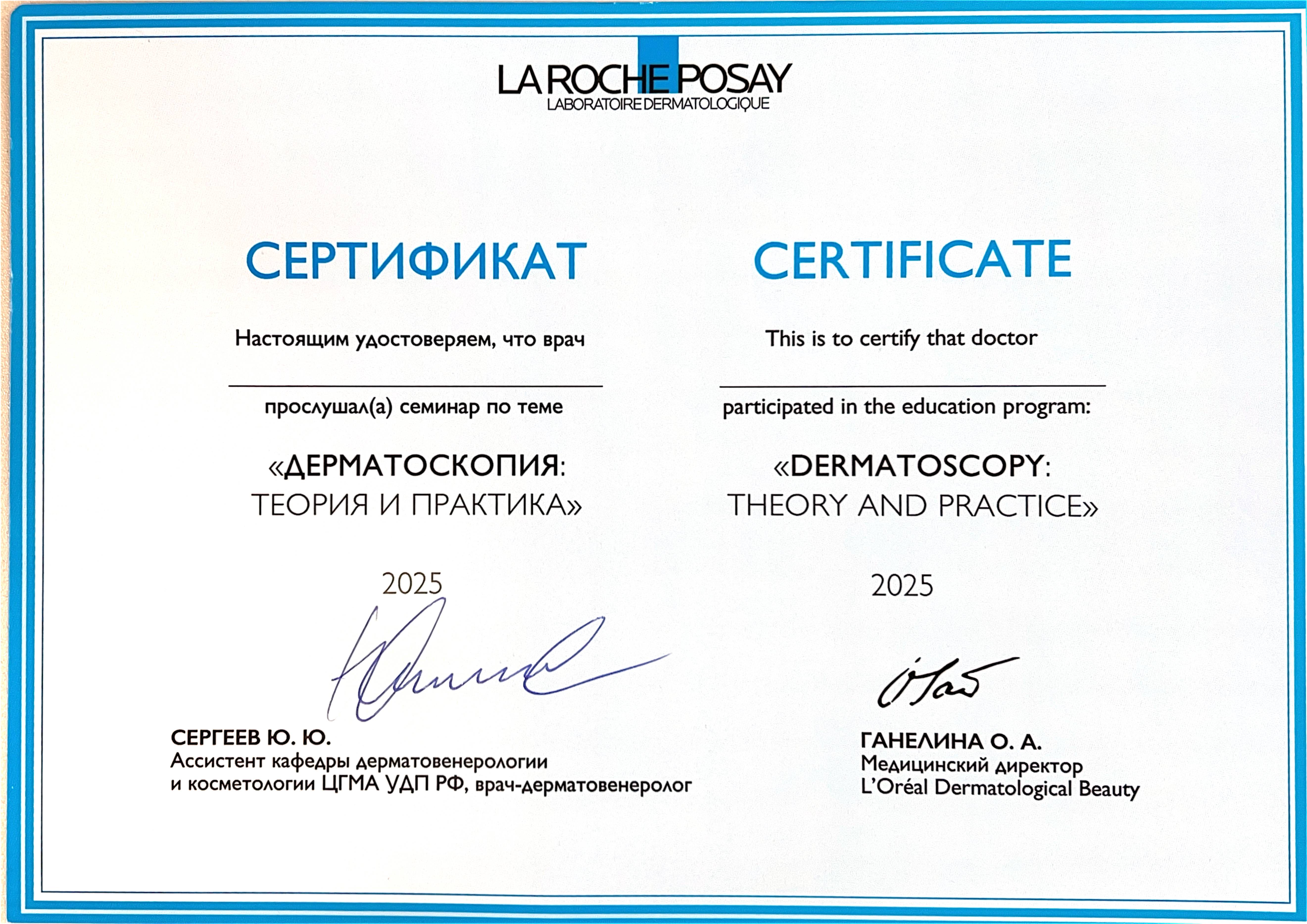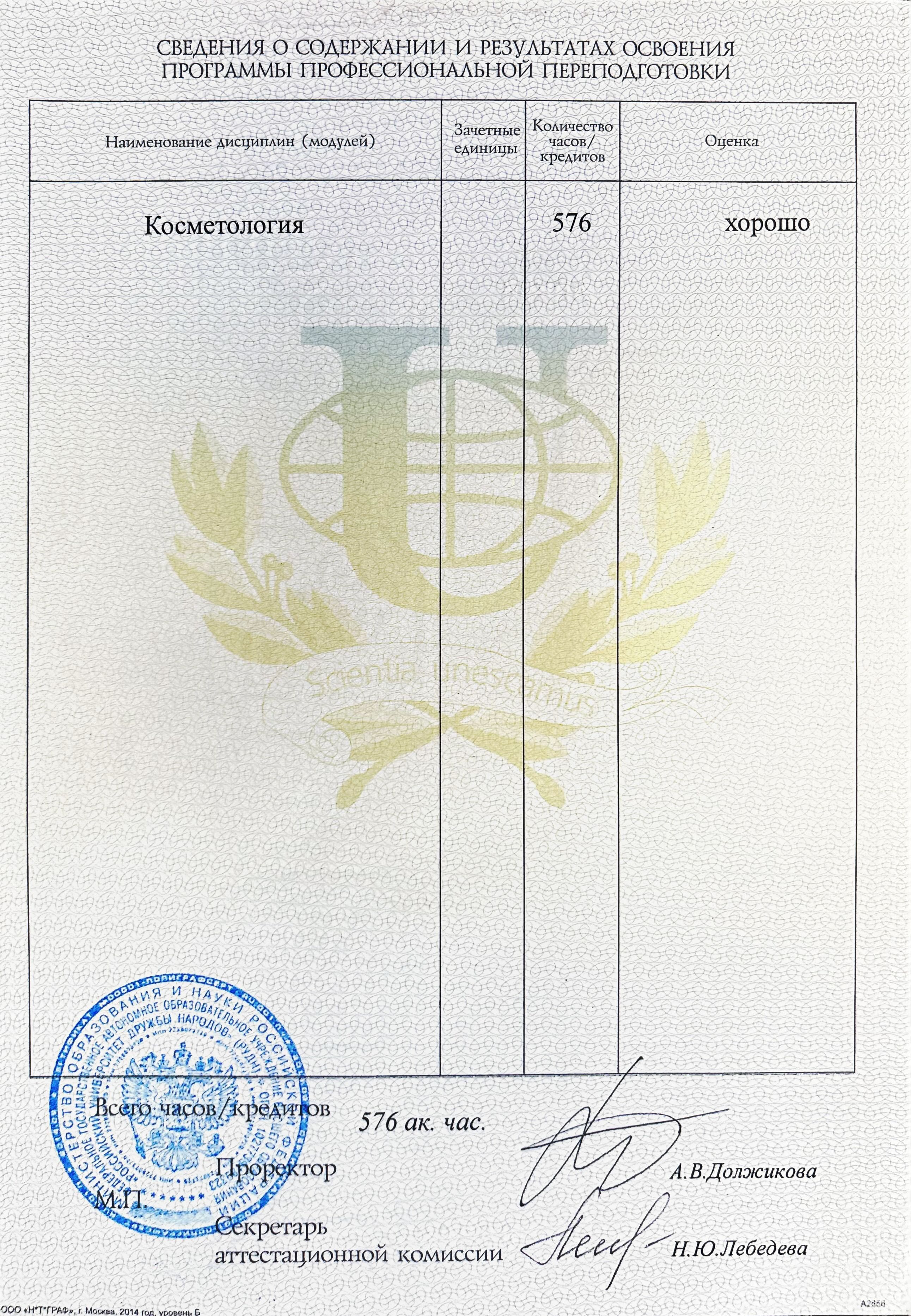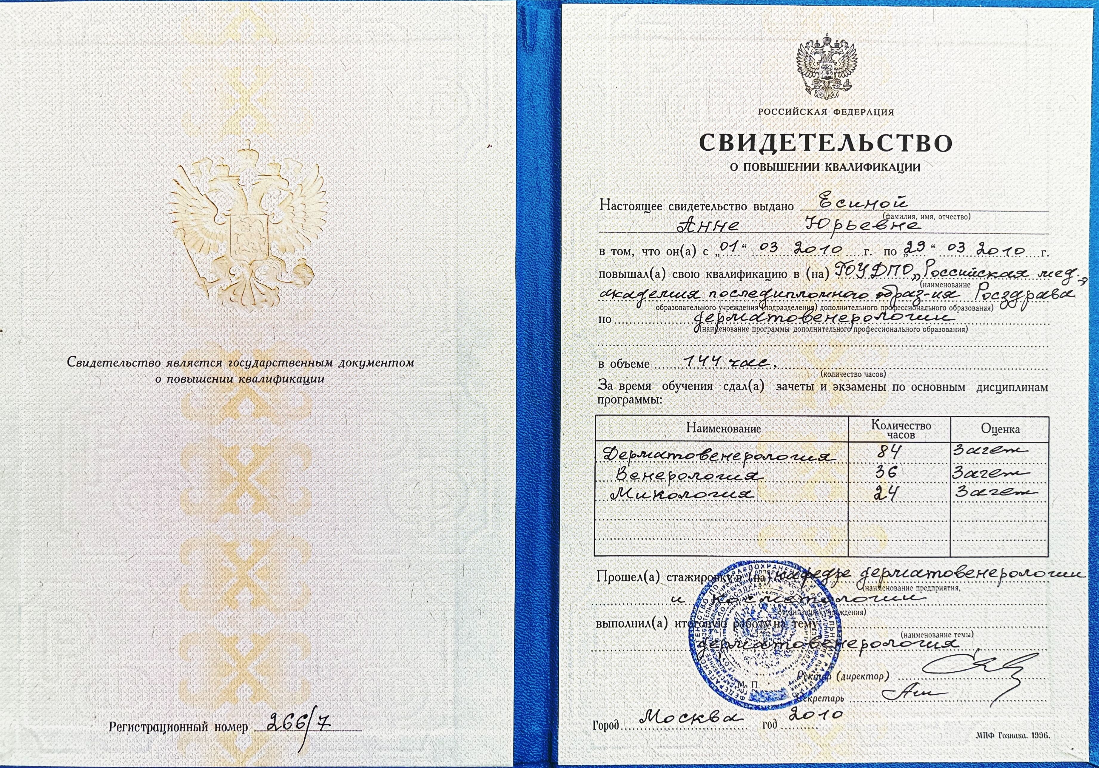 Сертификат специалиста-дерматовенеролога , косметолога продлено в 2010 году (действителен до 2020 года)