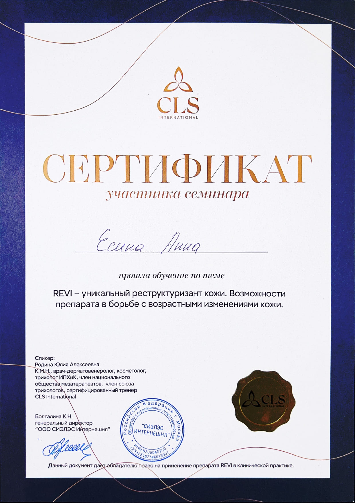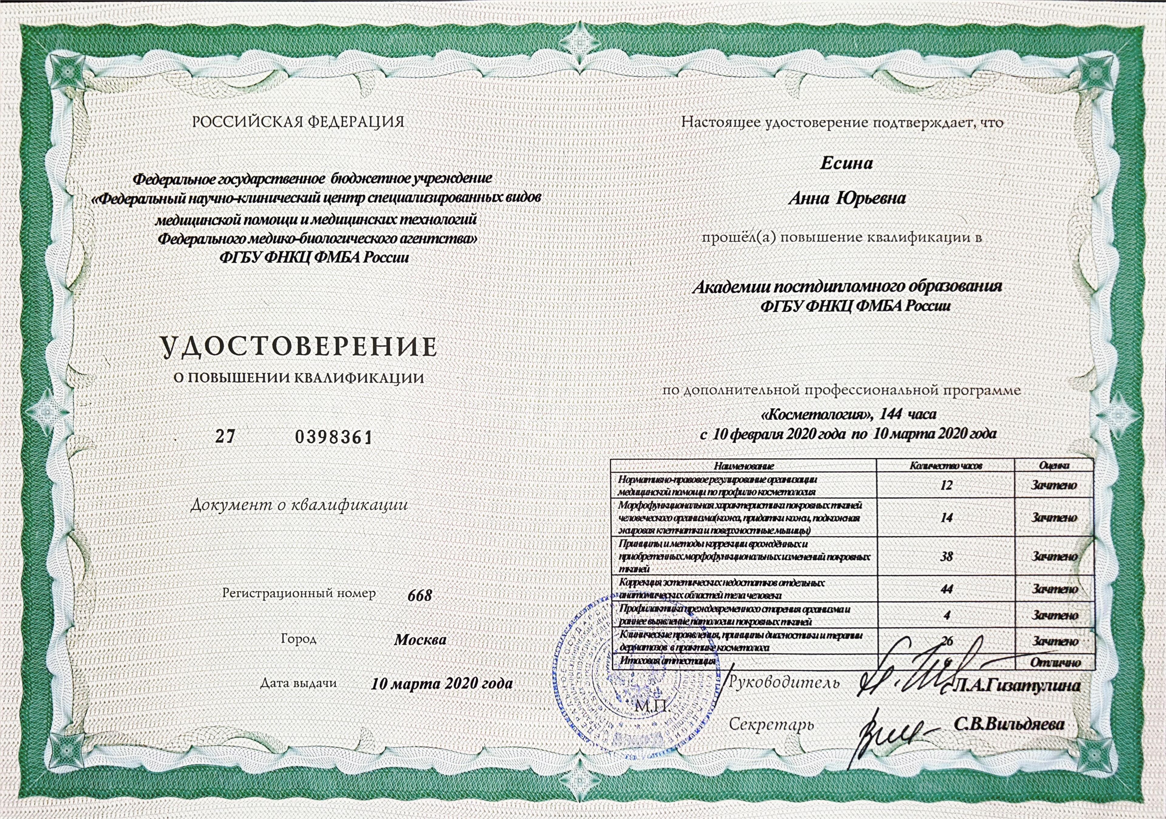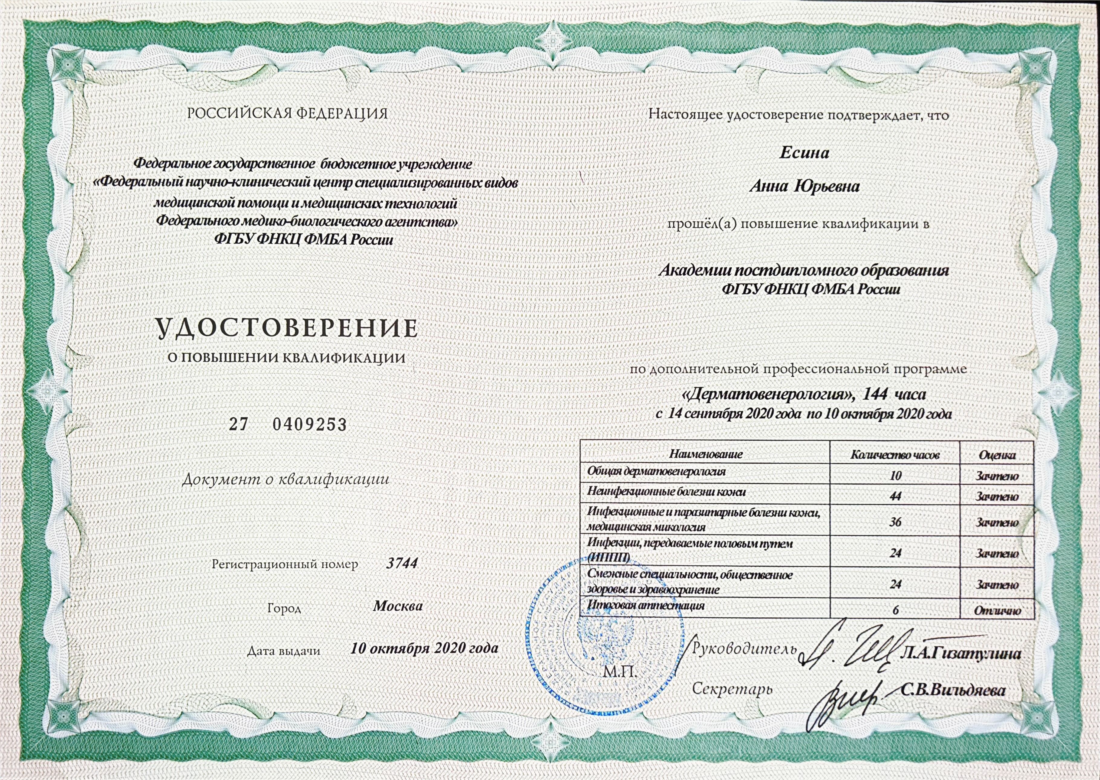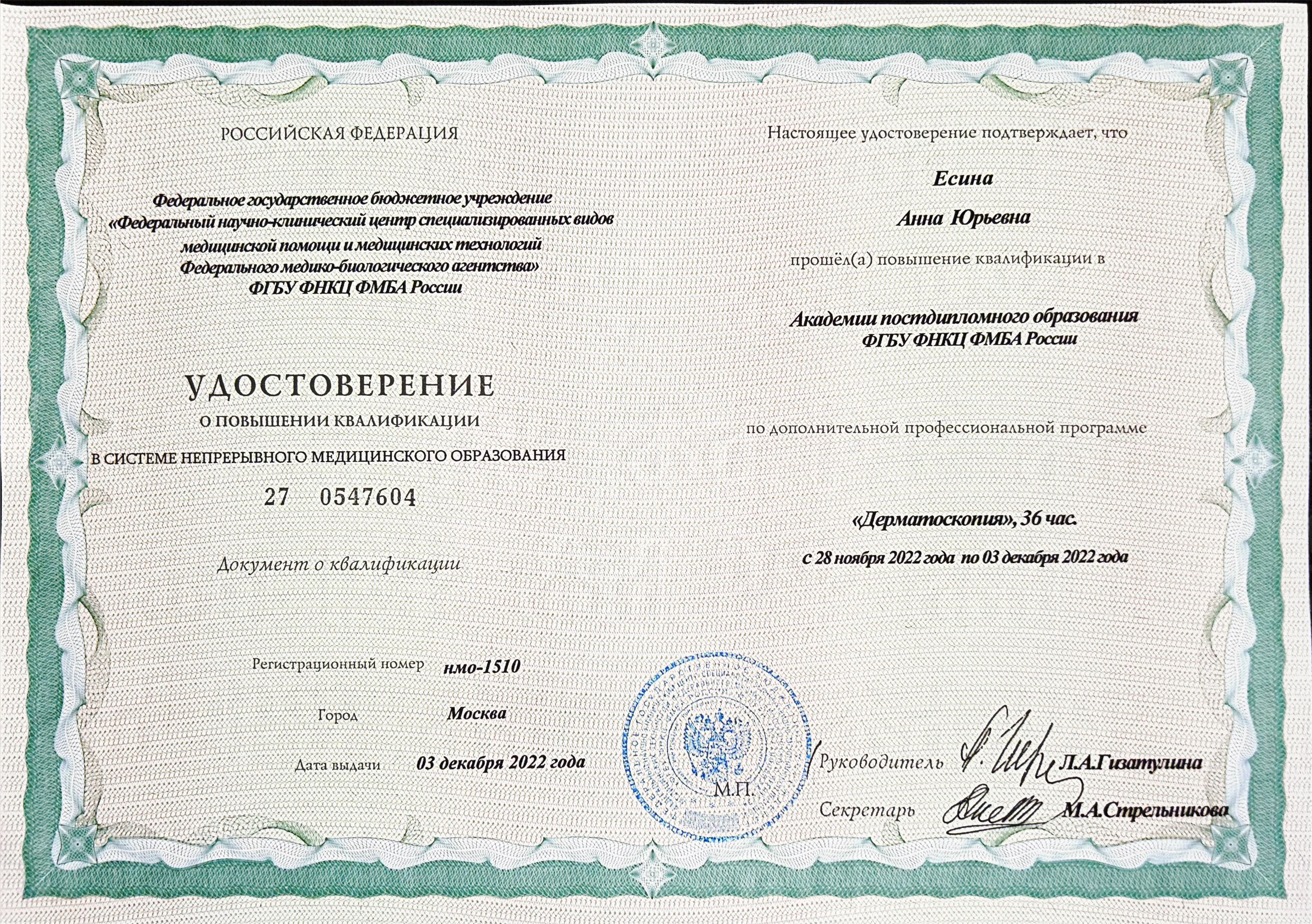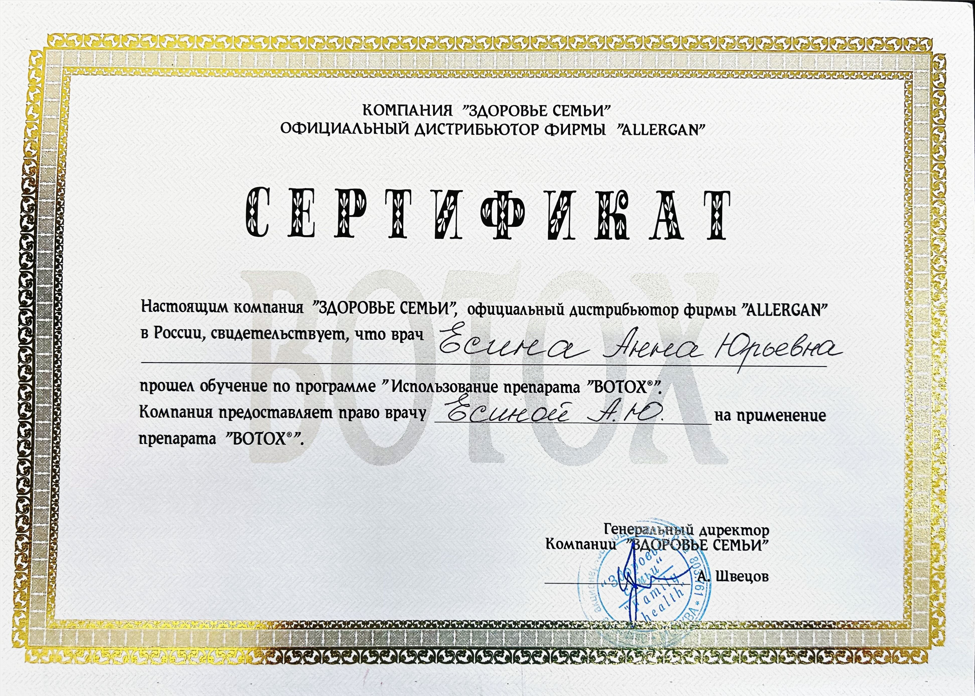 Сертификат специалиста-дерматовенеролога , косметолога продлено в 2010 году (действителен до 2020 года)
