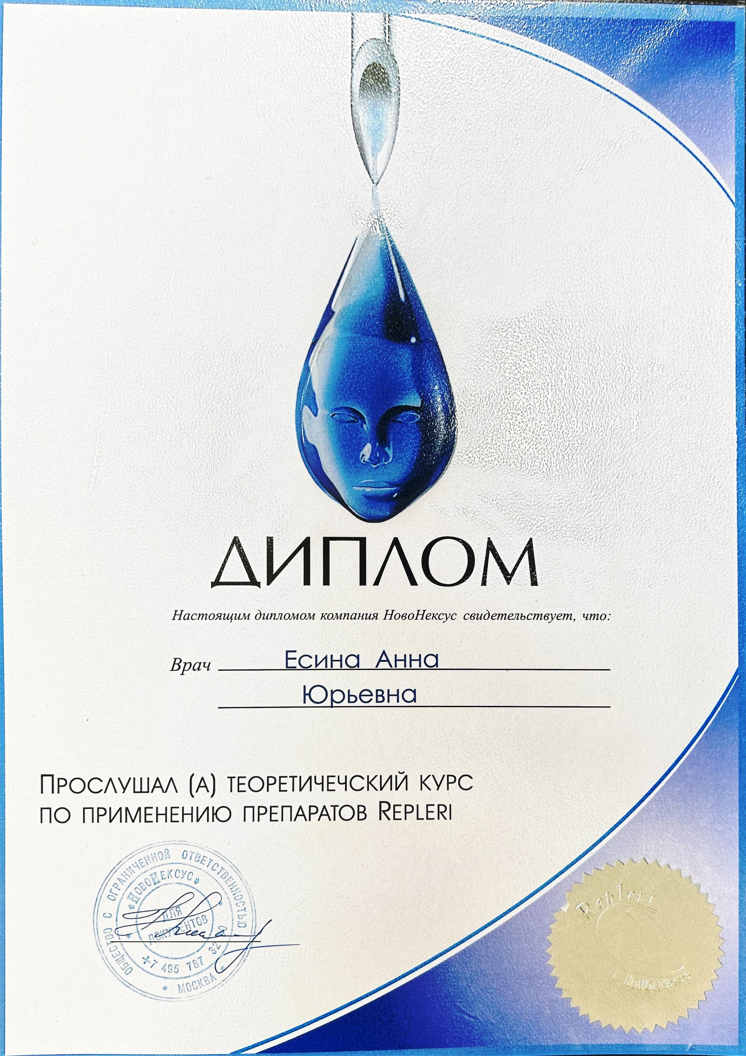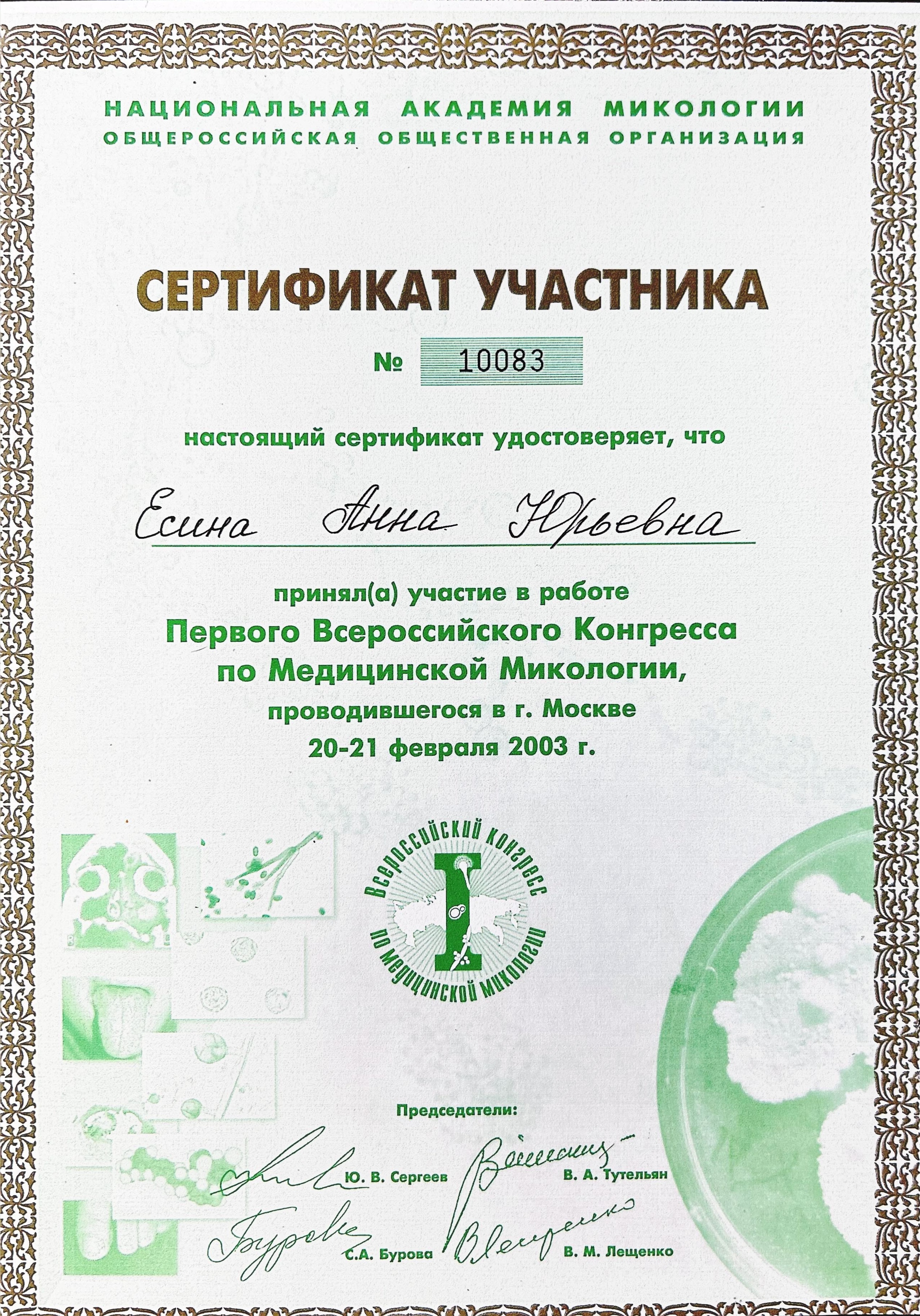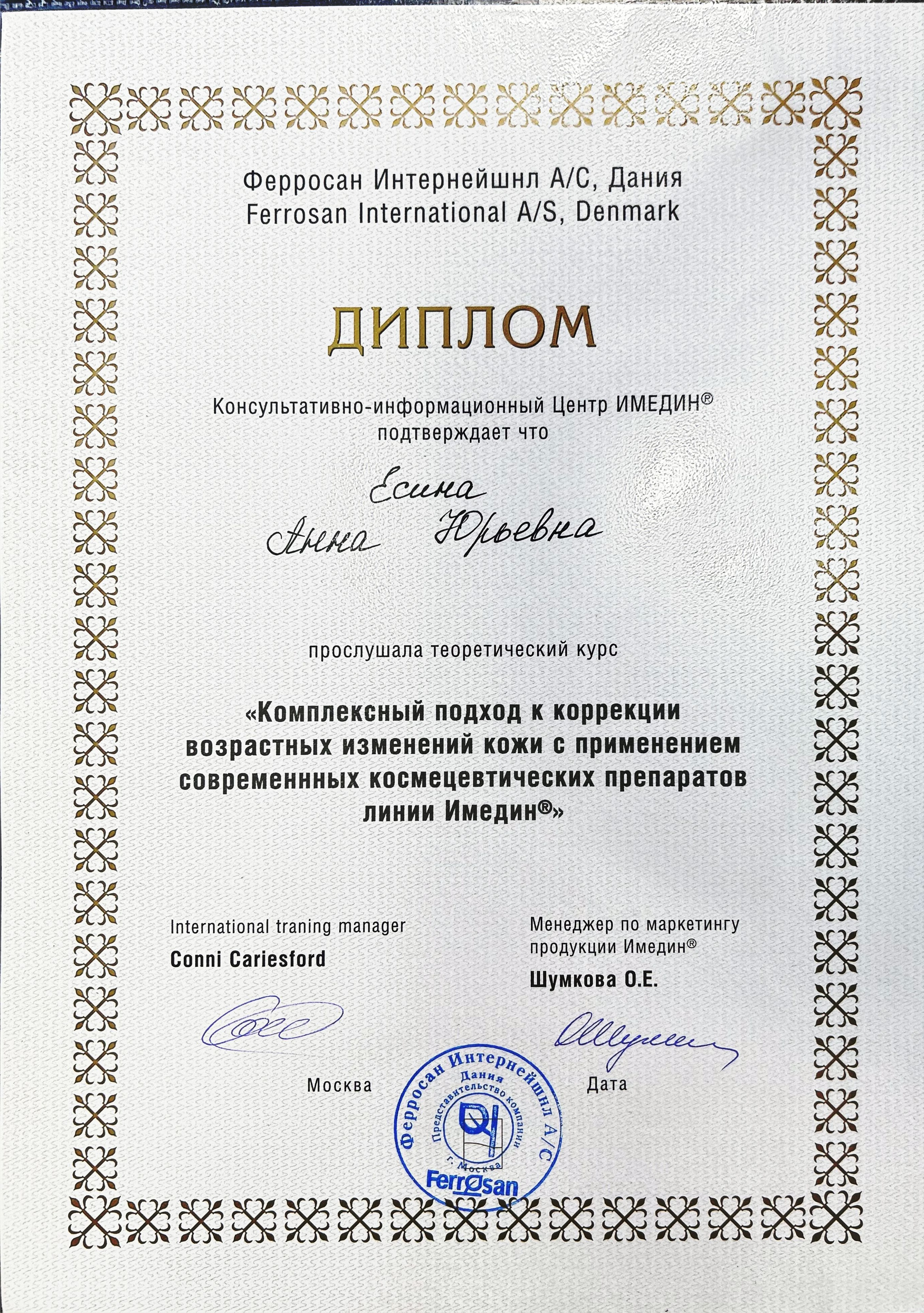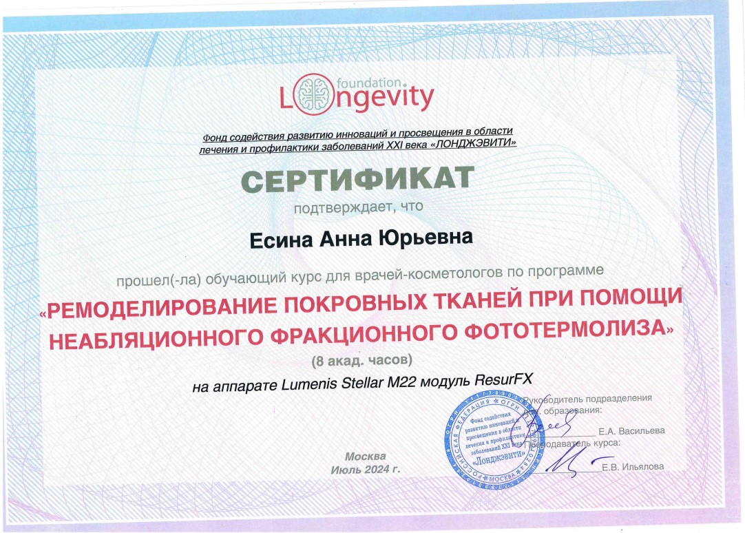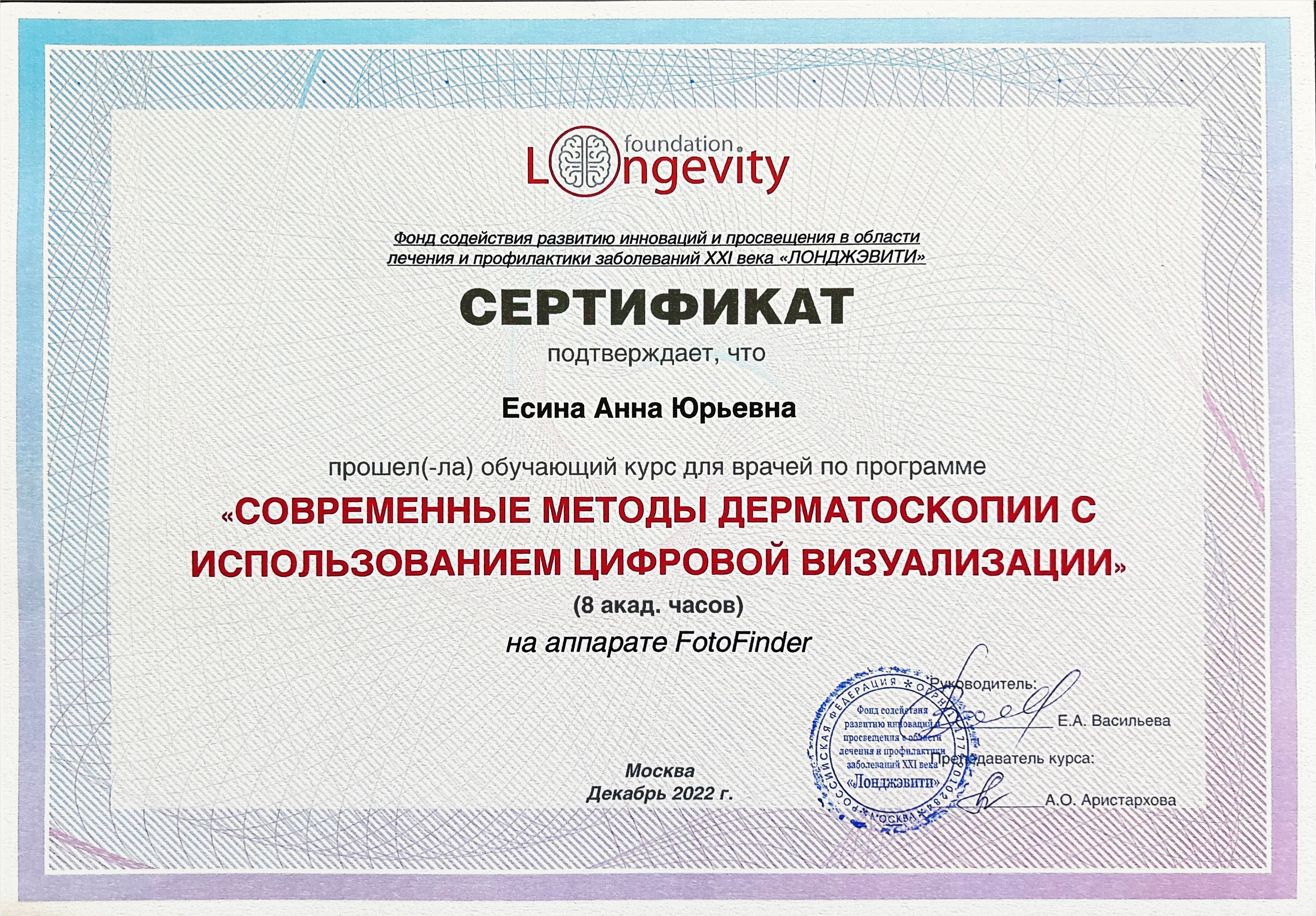 Сертификат специалиста-дерматовенеролога , косметолога продлено в 2010 году (действителен до 2020 года)