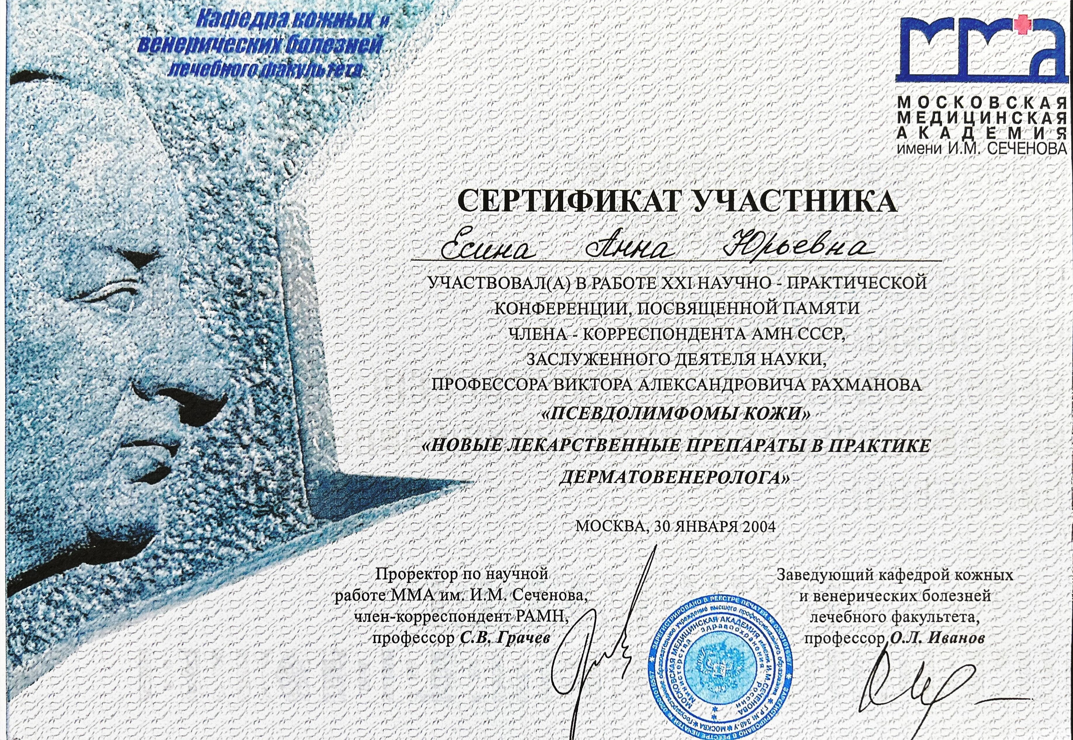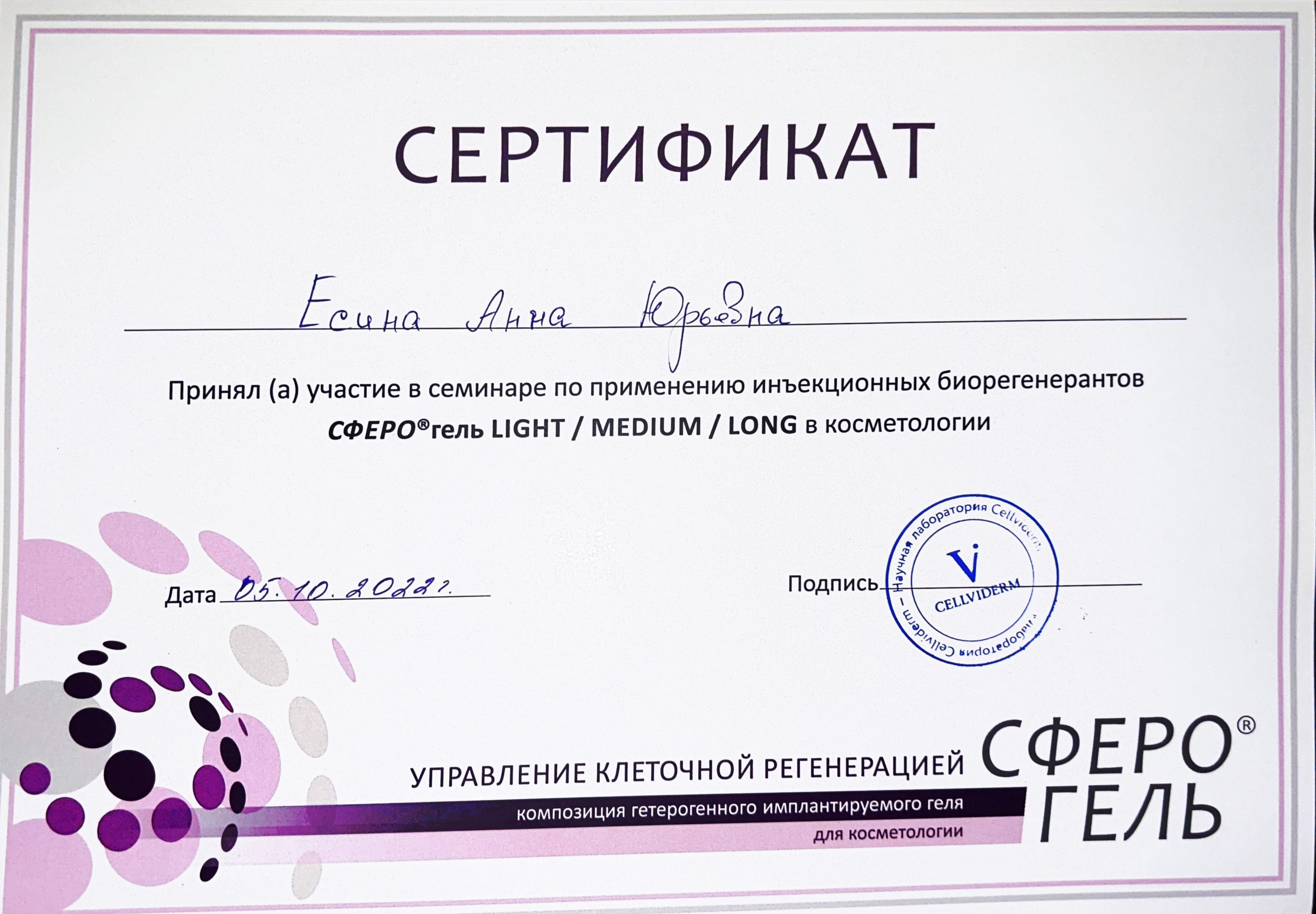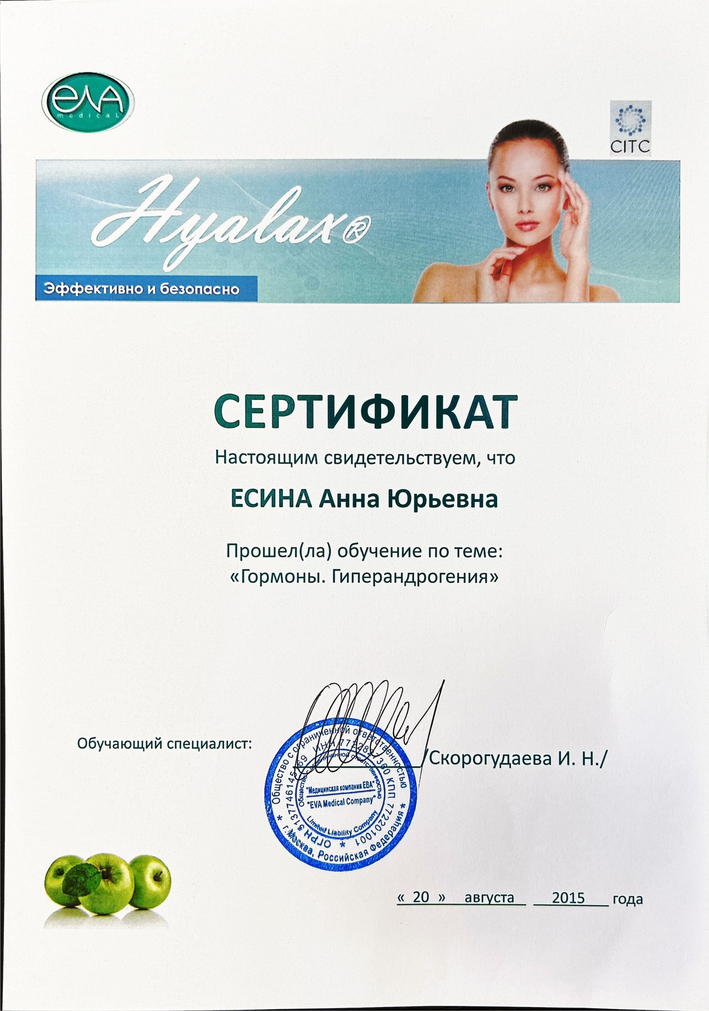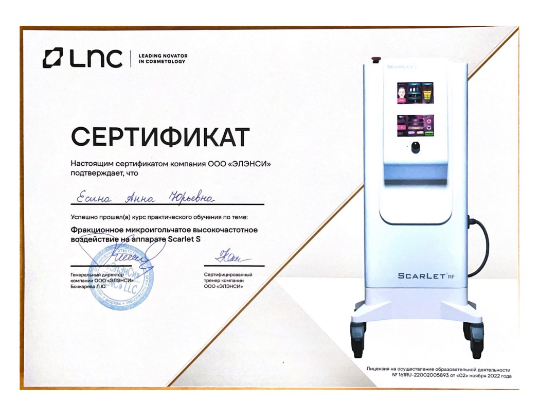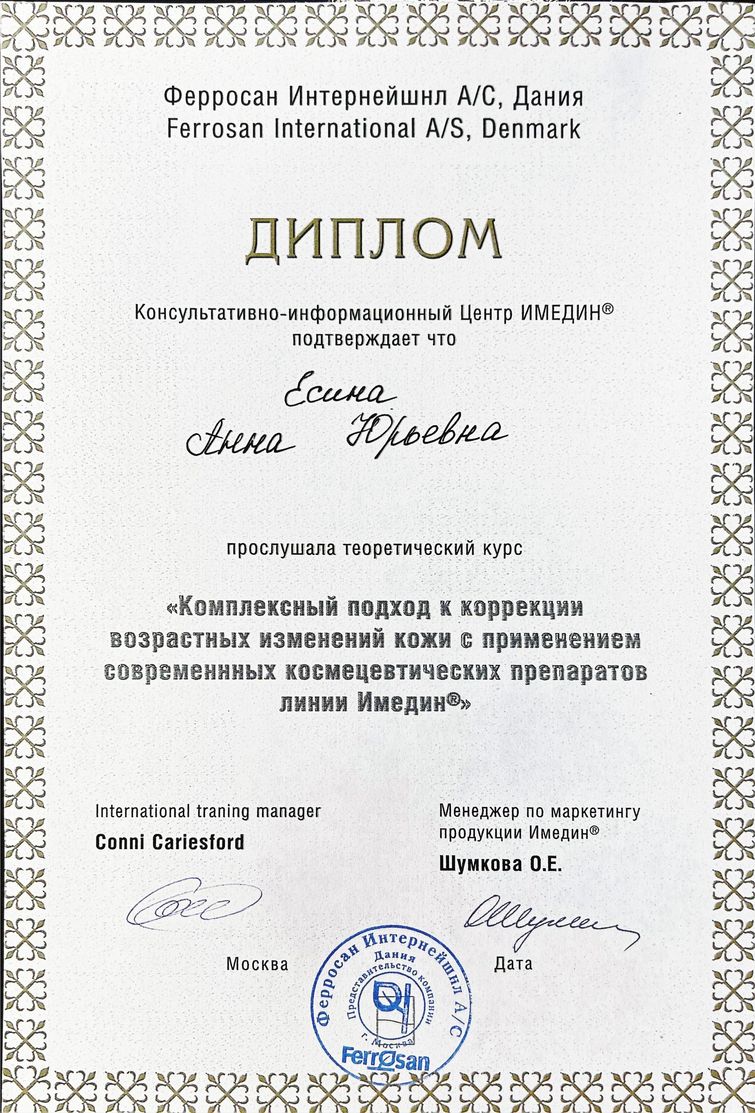 Сертификат специалиста-дерматовенеролога , косметолога продлено в 2010 году (действителен до 2020 года)