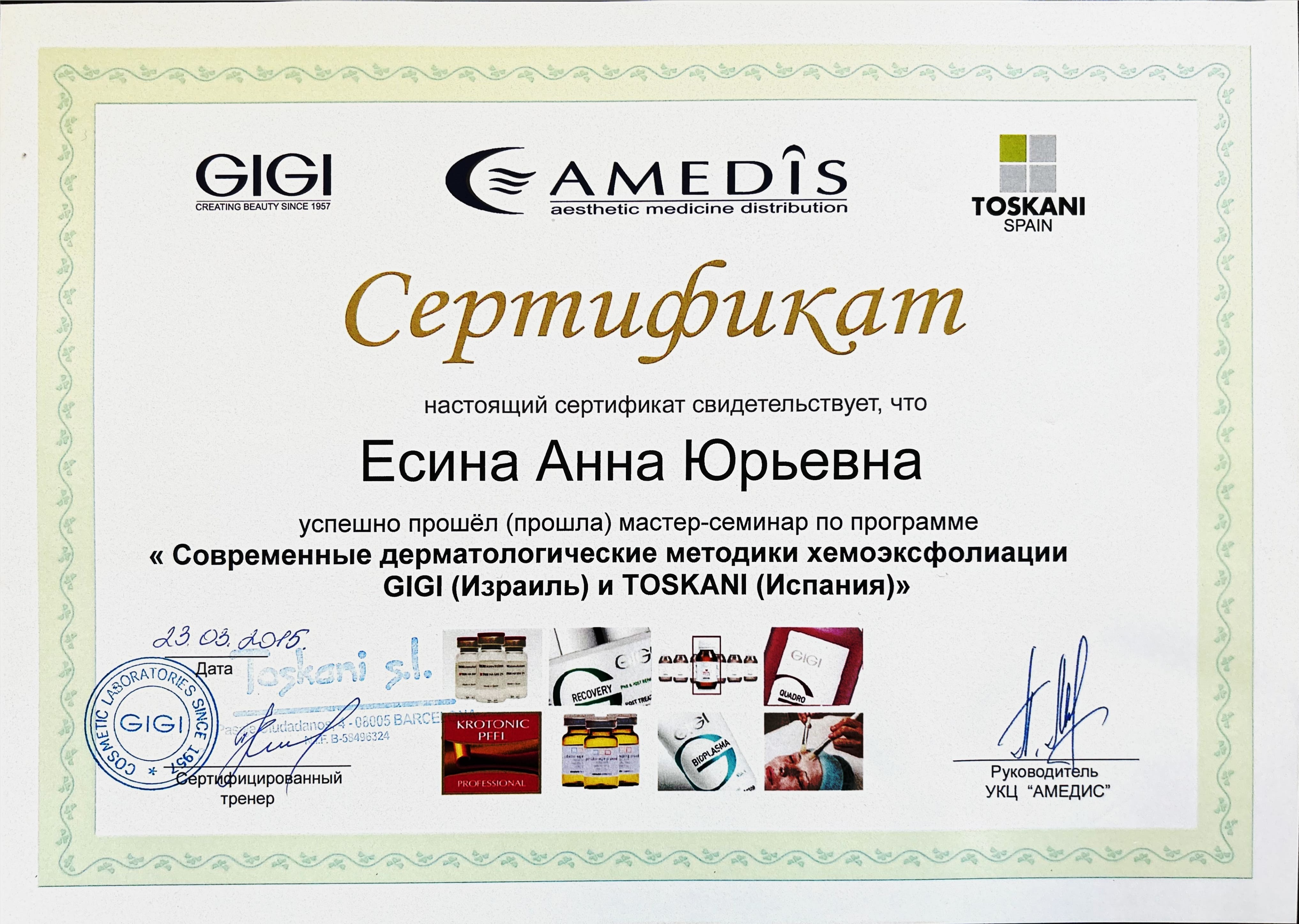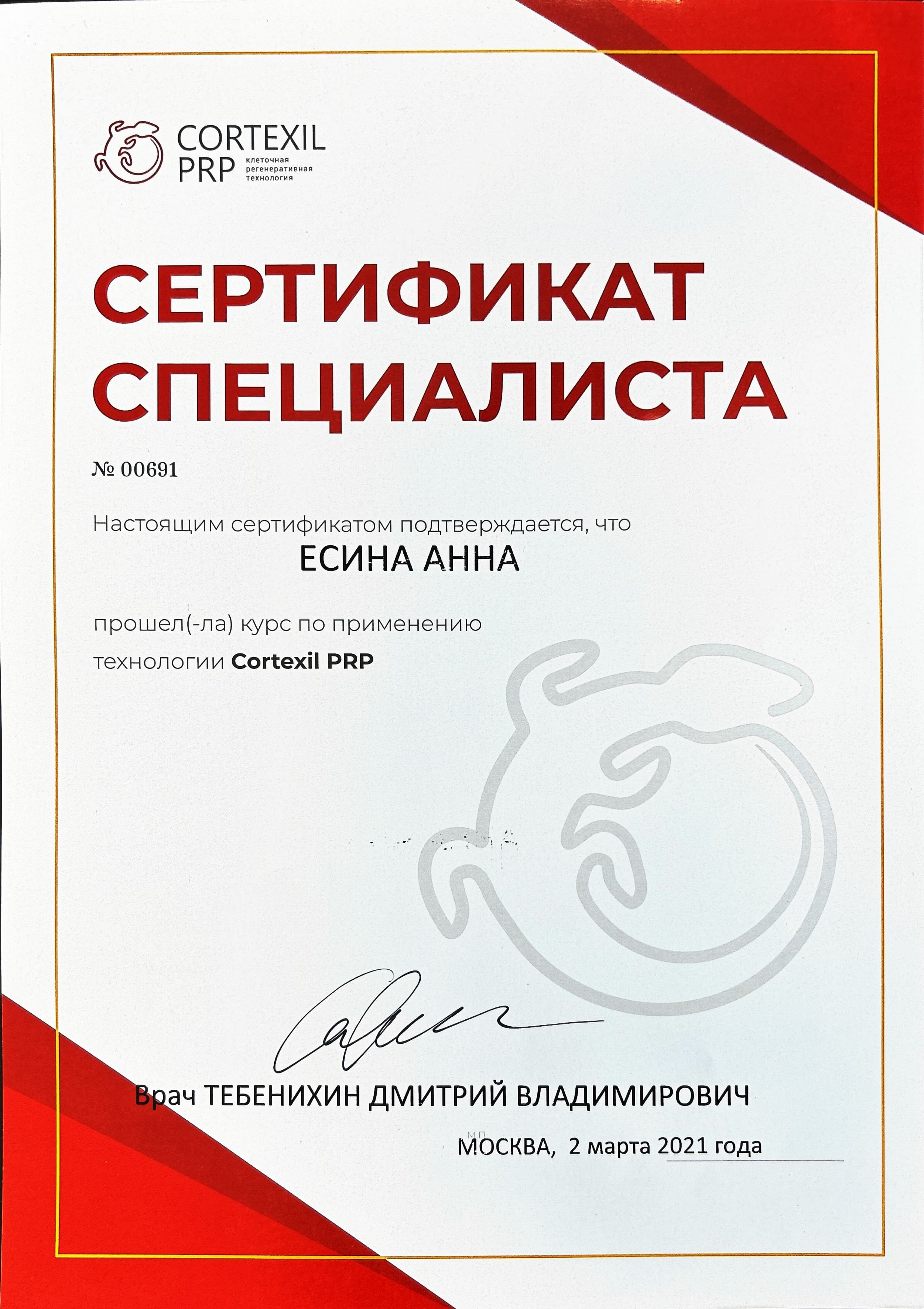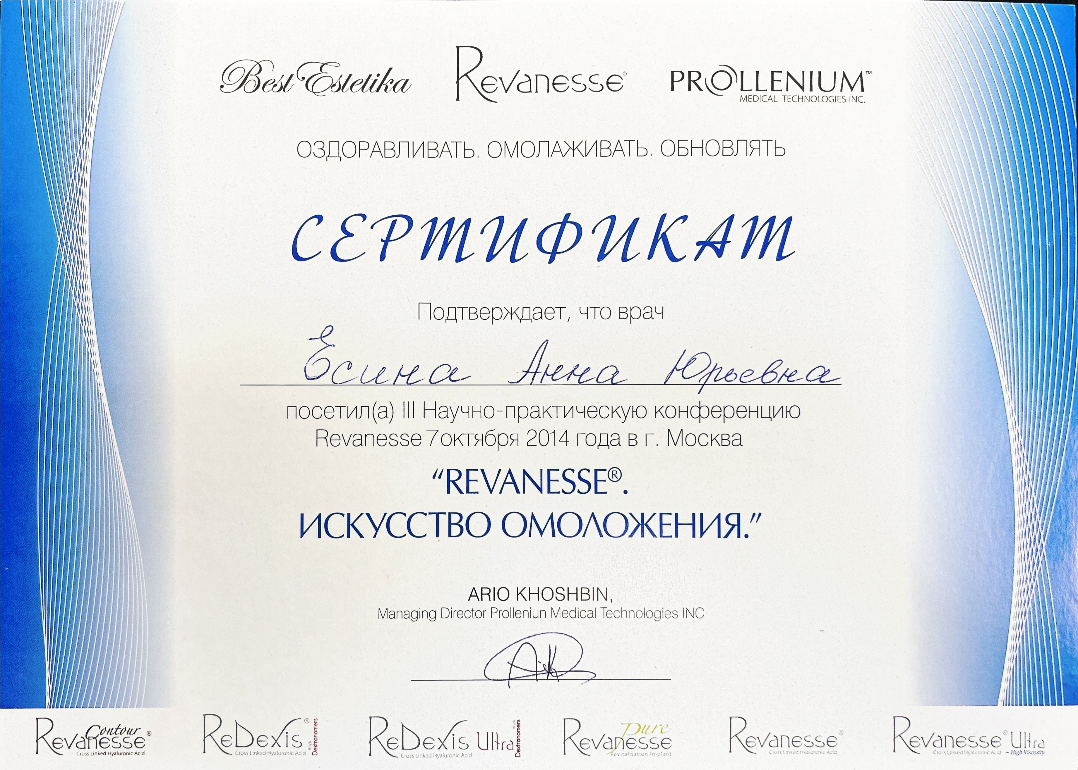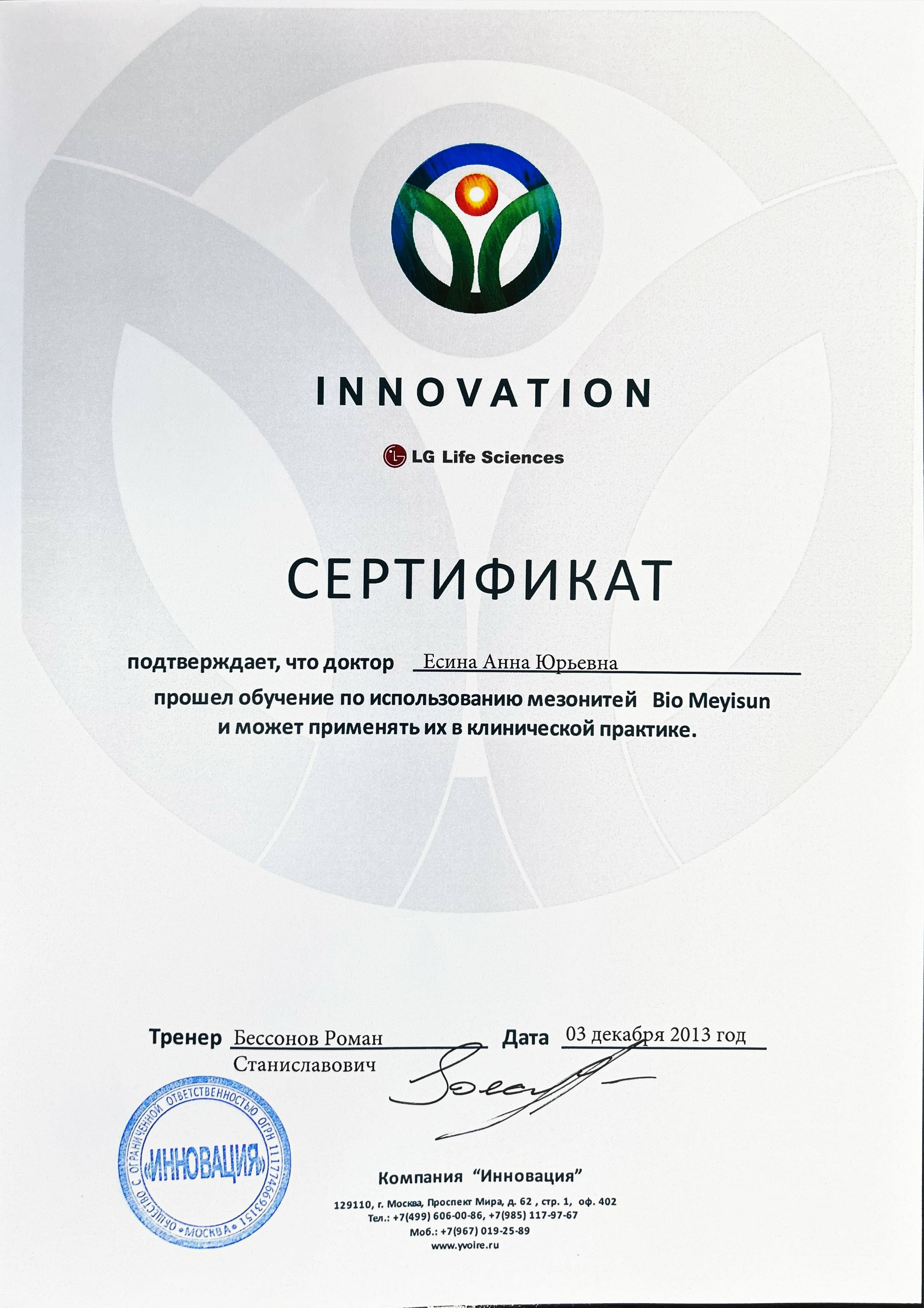 Сертификат специалиста-дерматовенеролога , косметолога продлено в 2010 году (действителен до 2020 года)