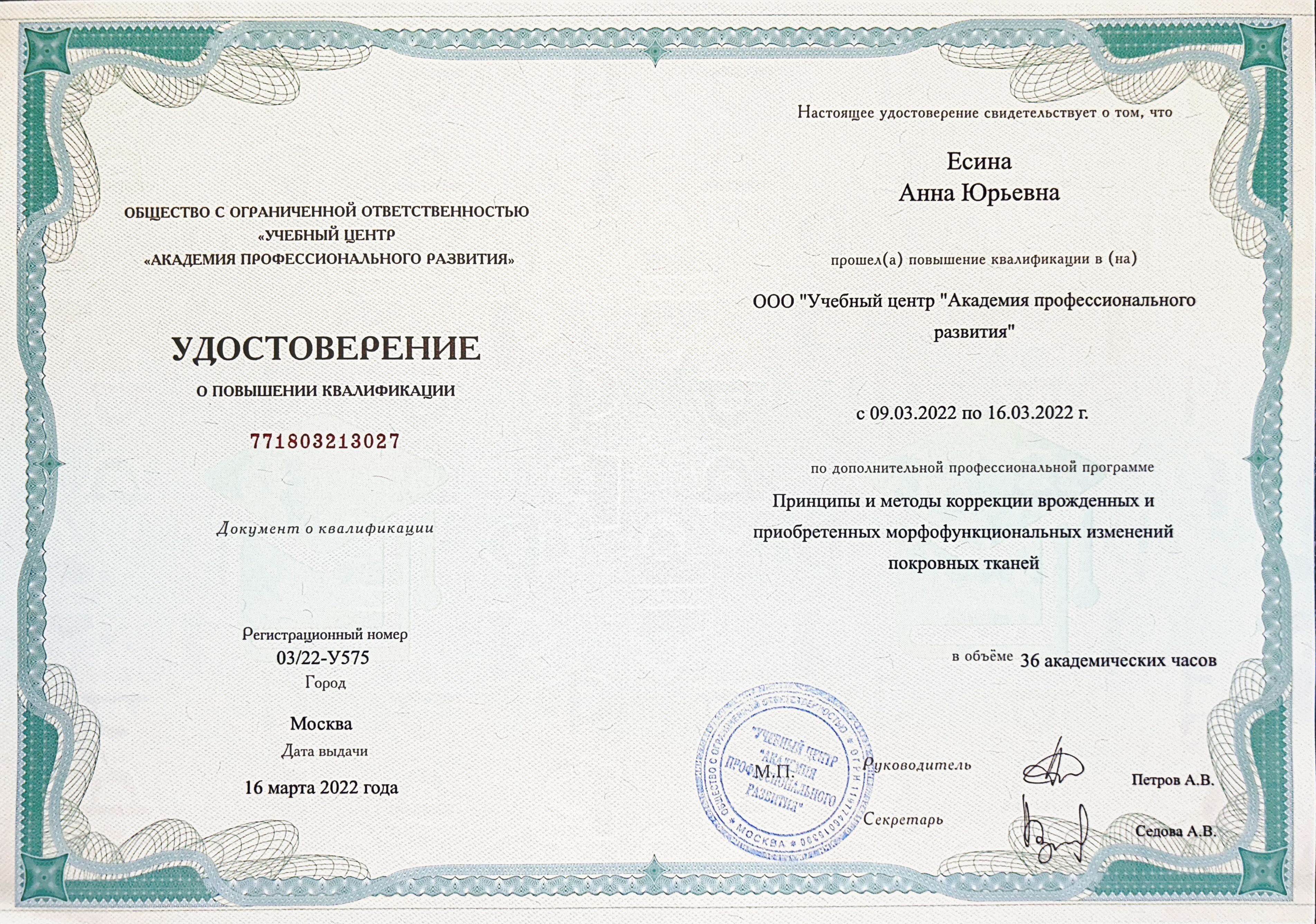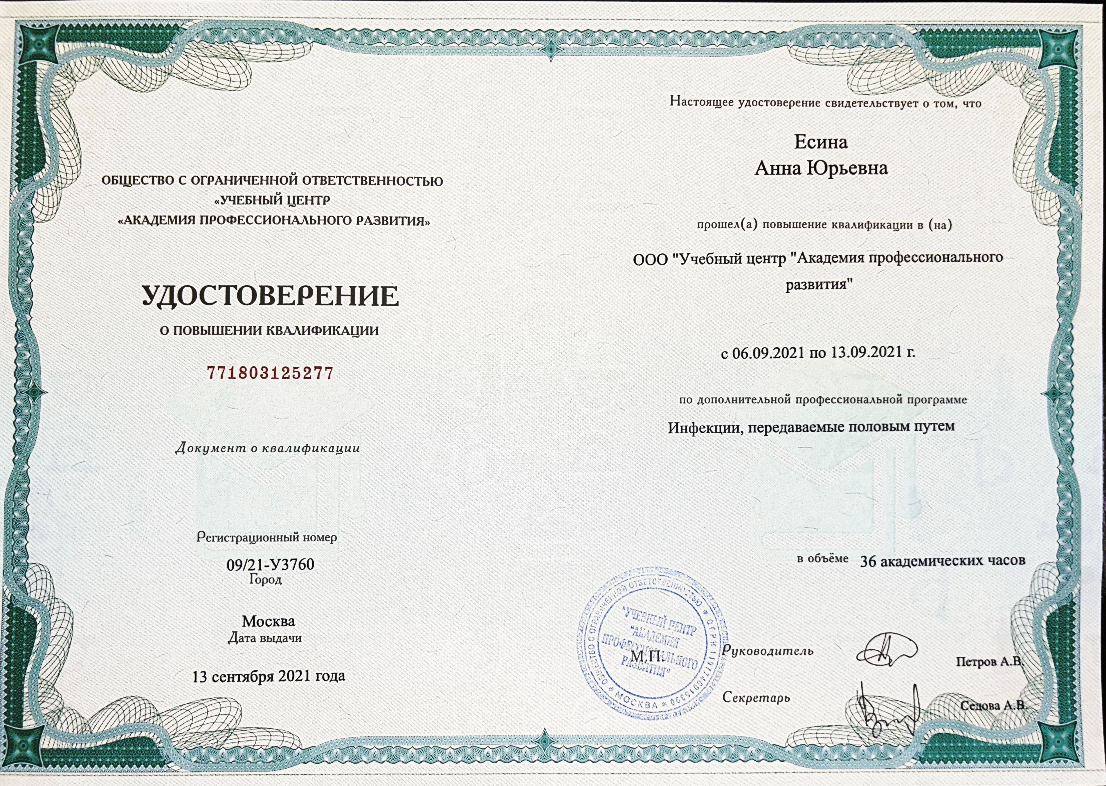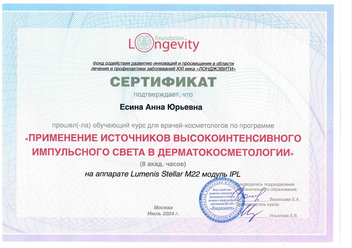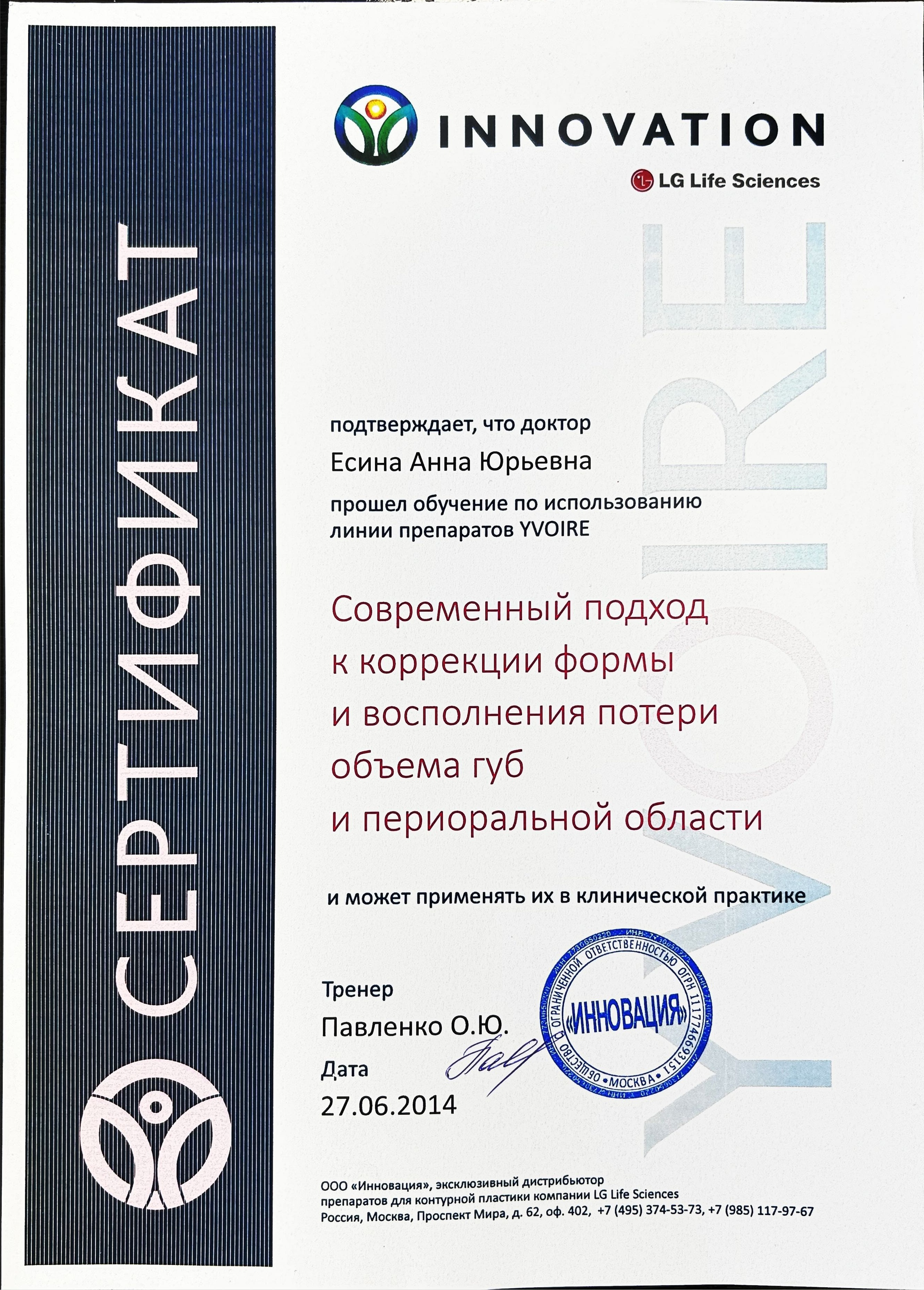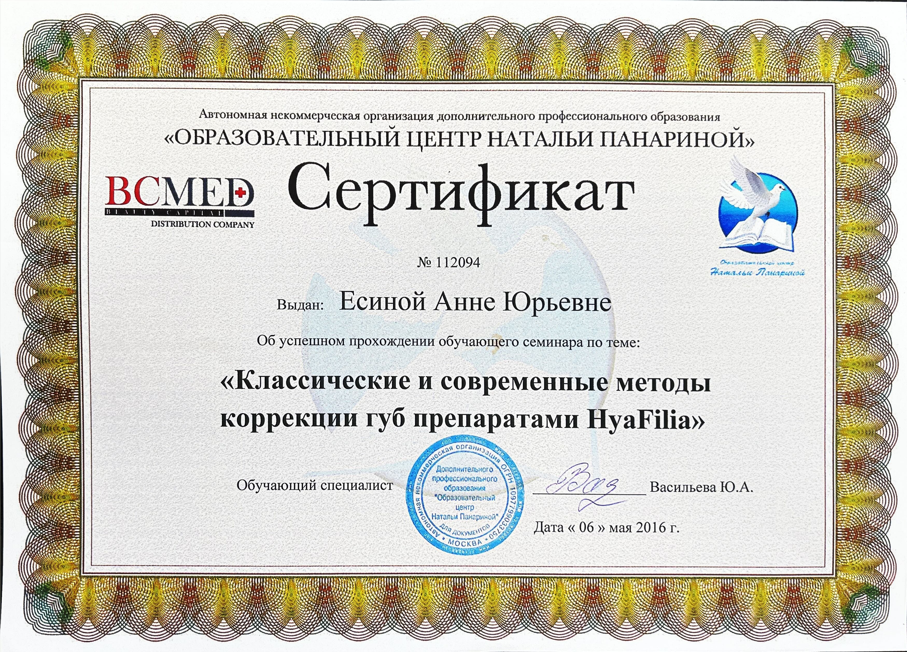 Сертификат специалиста-дерматовенеролога , косметолога продлено в 2010 году (действителен до 2020 года)