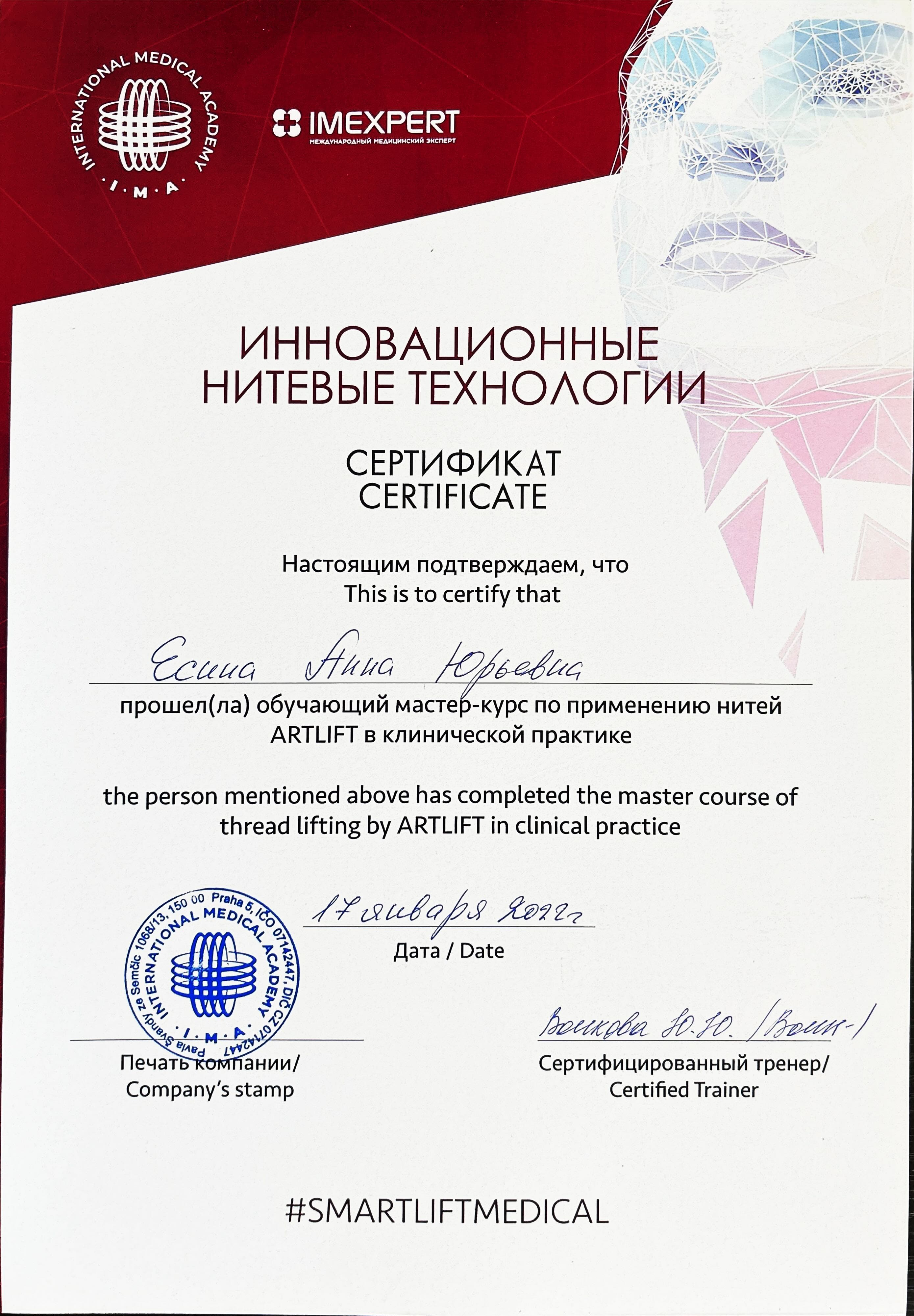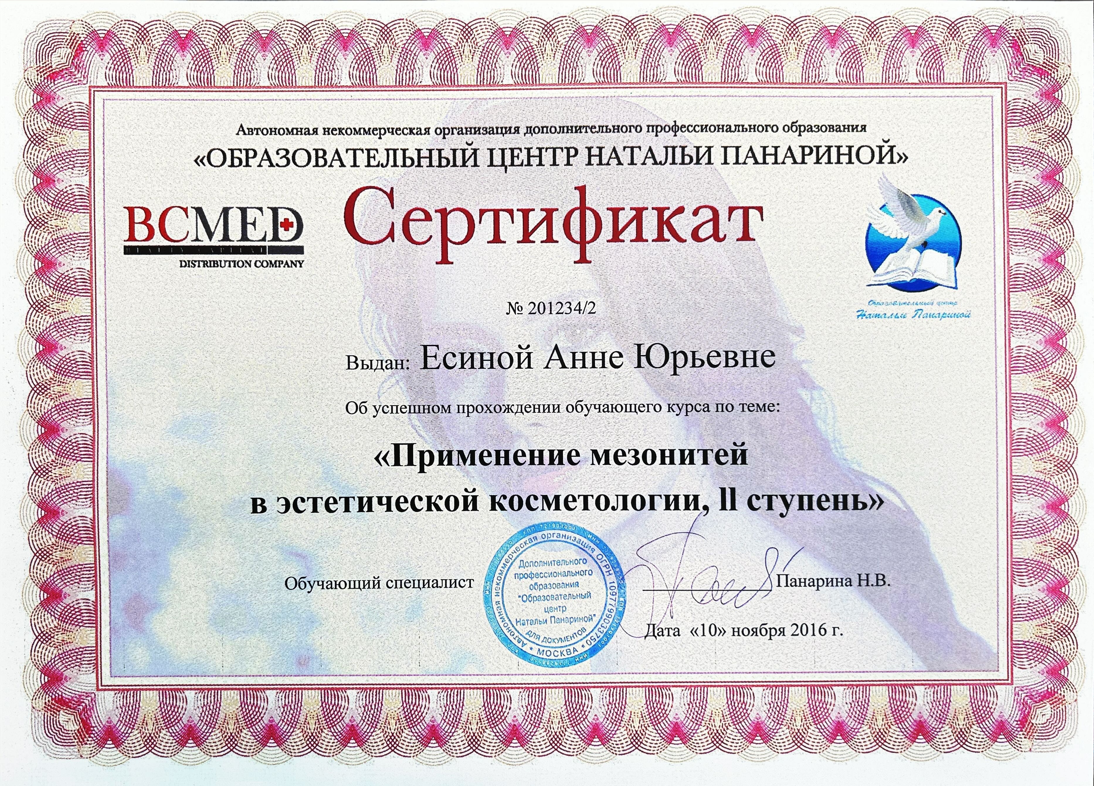 Сертификат на обучение по "Применению мезонитей в эстетической косметологии 1 и 2 ступени".