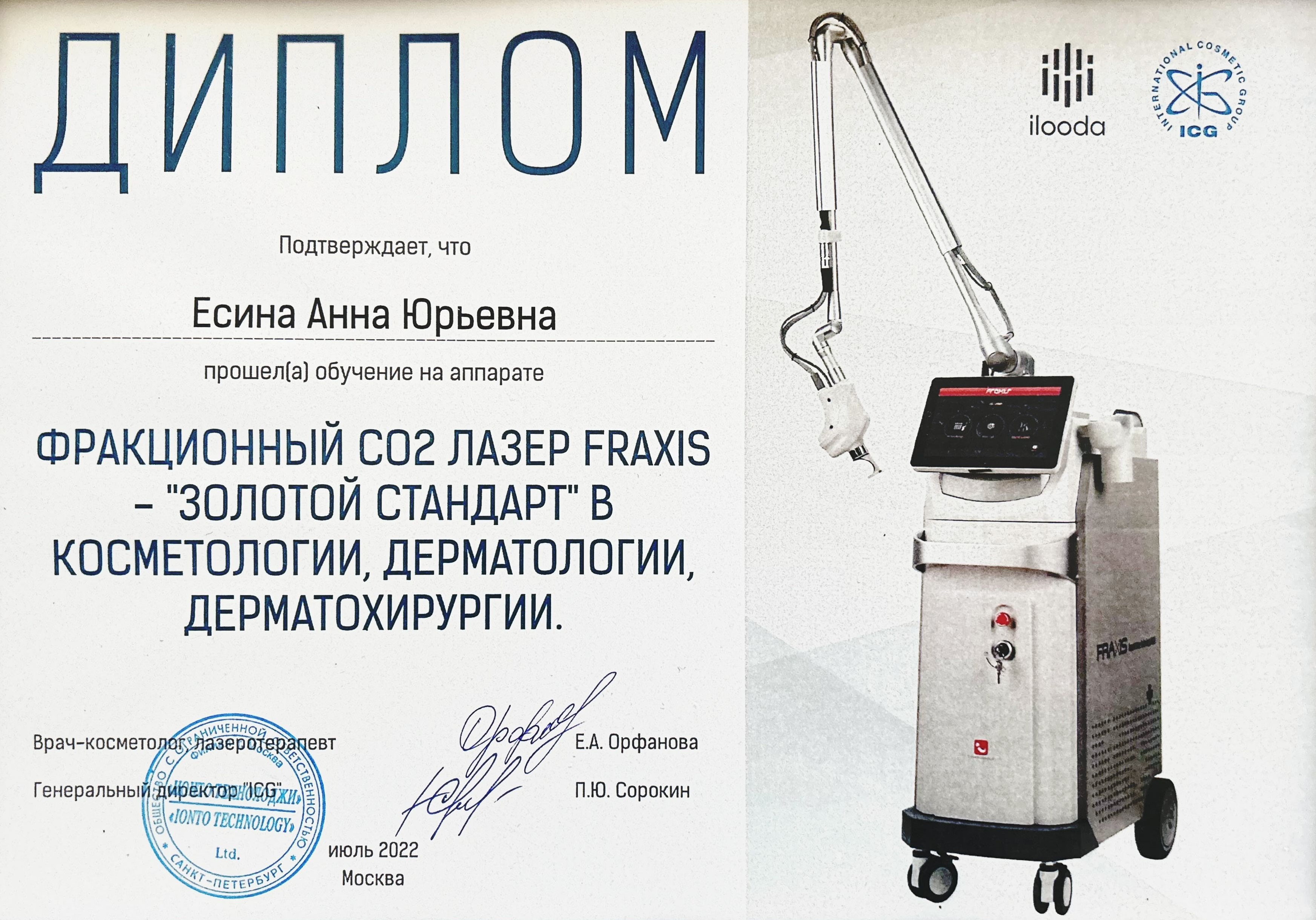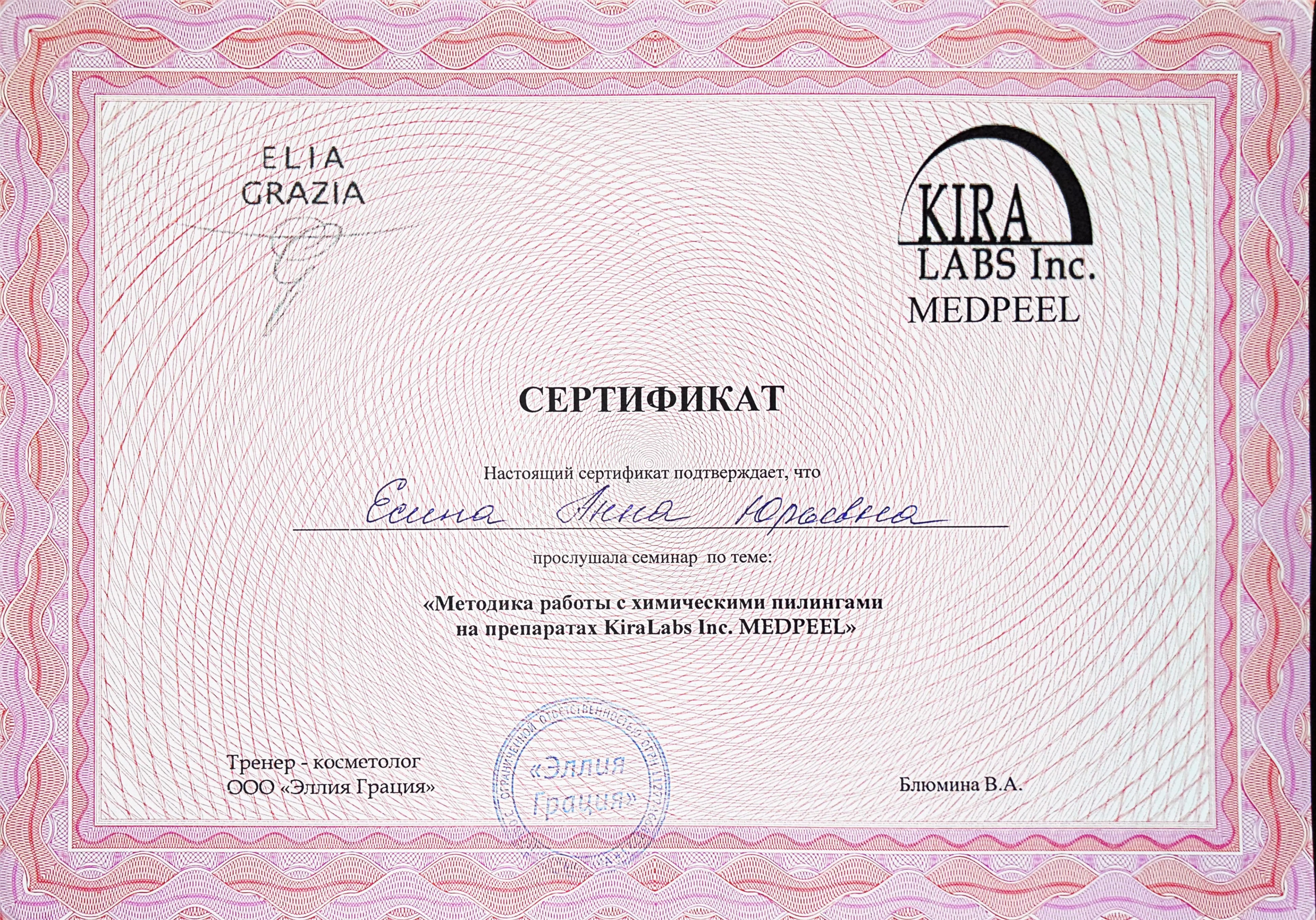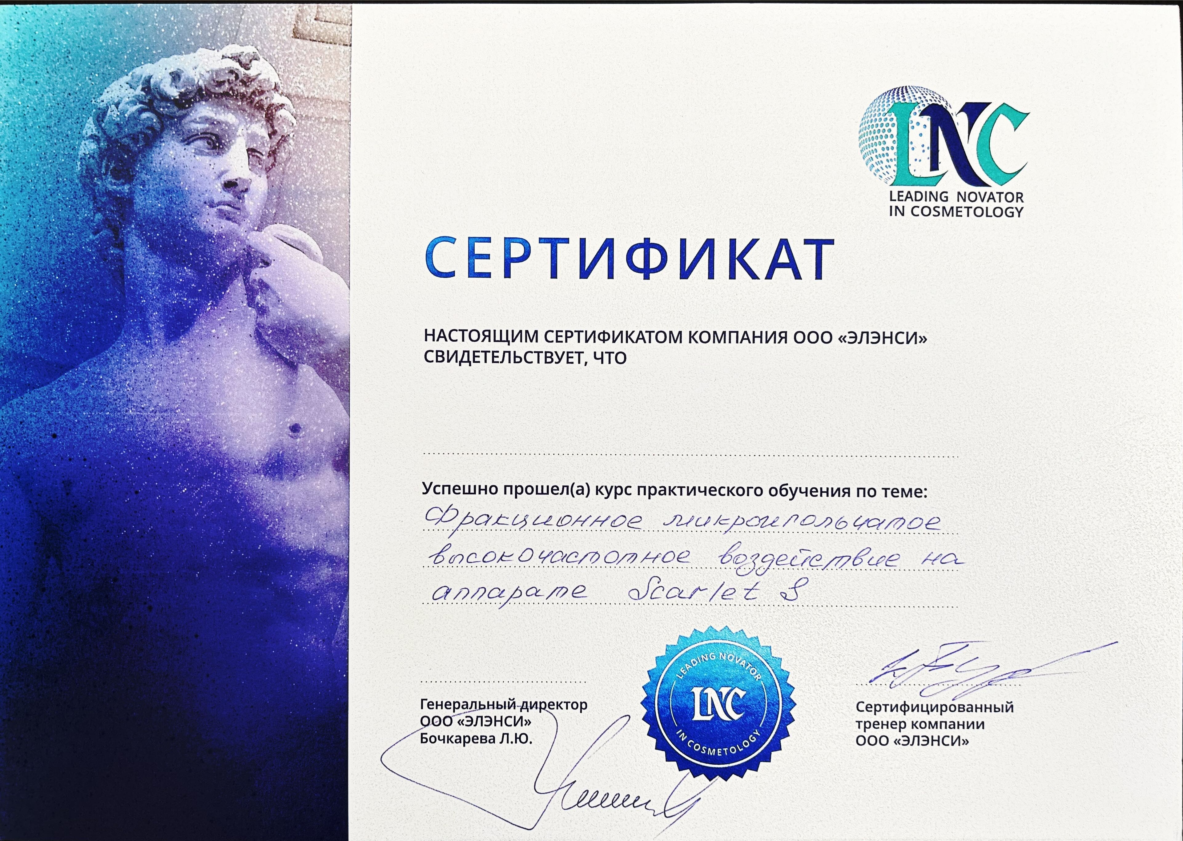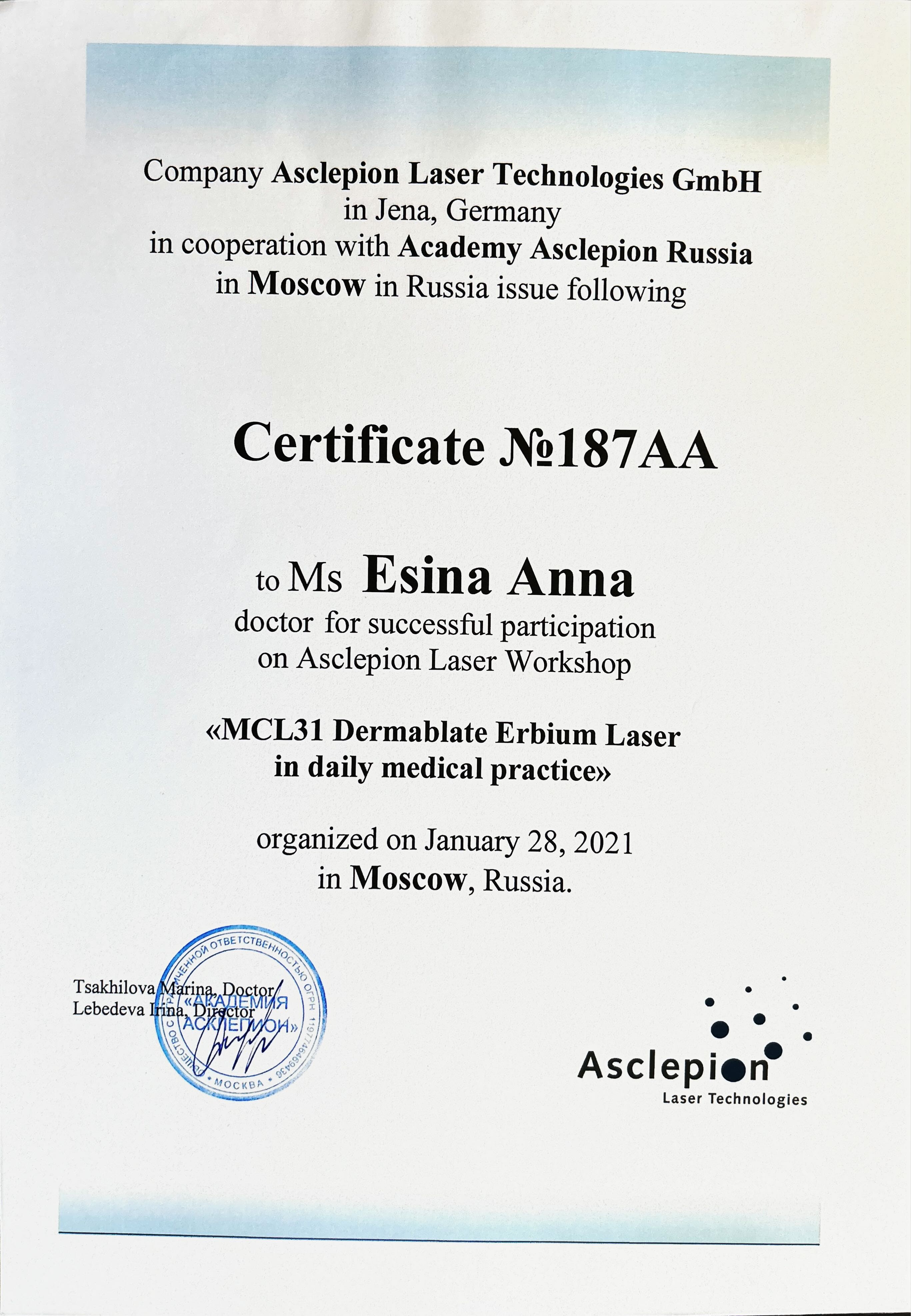 Сертификаты по окончанию теоретического и практического курса обучения на аппаратах: Diode lasers MeDioStar; «MCL 31 Dermablate Erbium Laser»