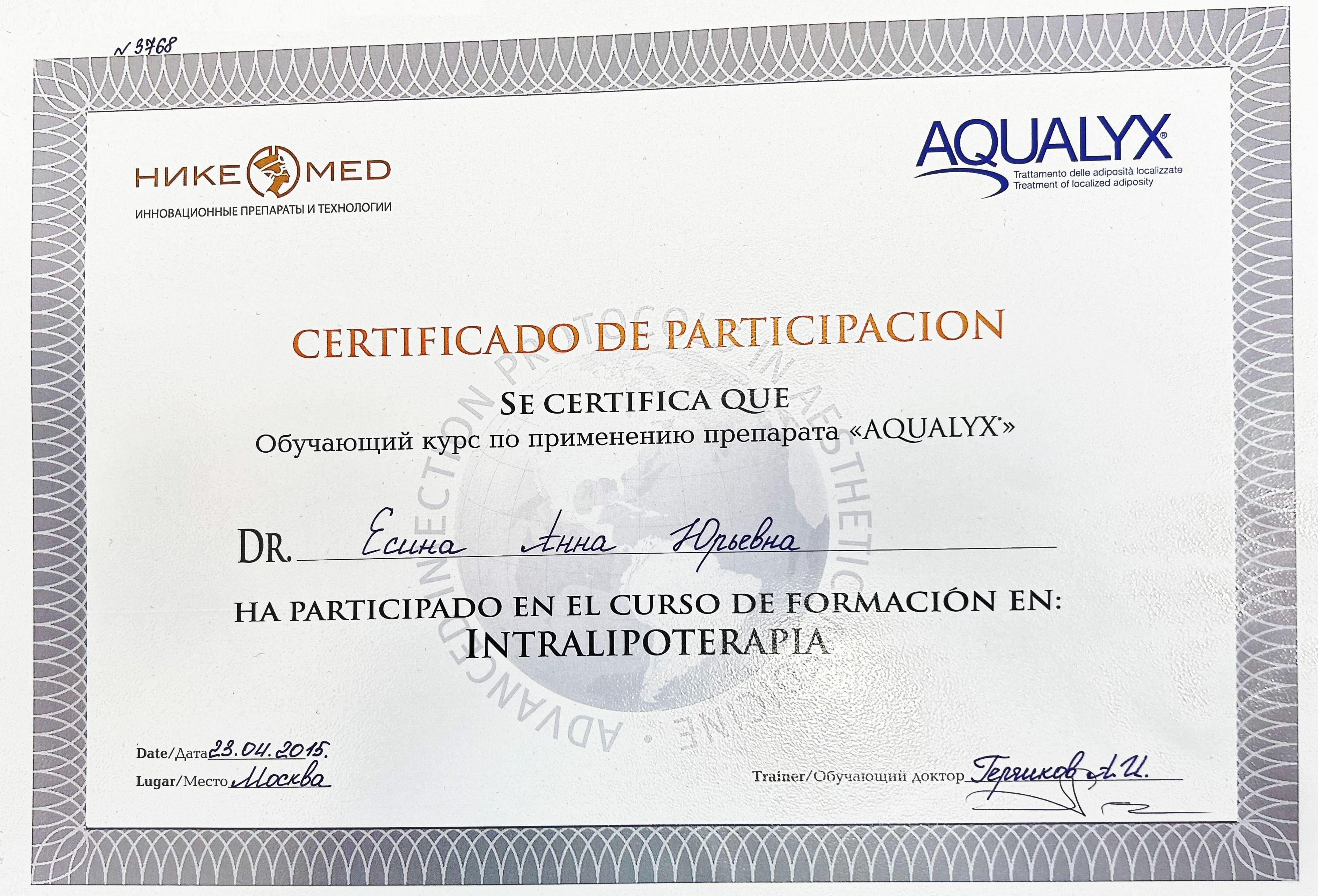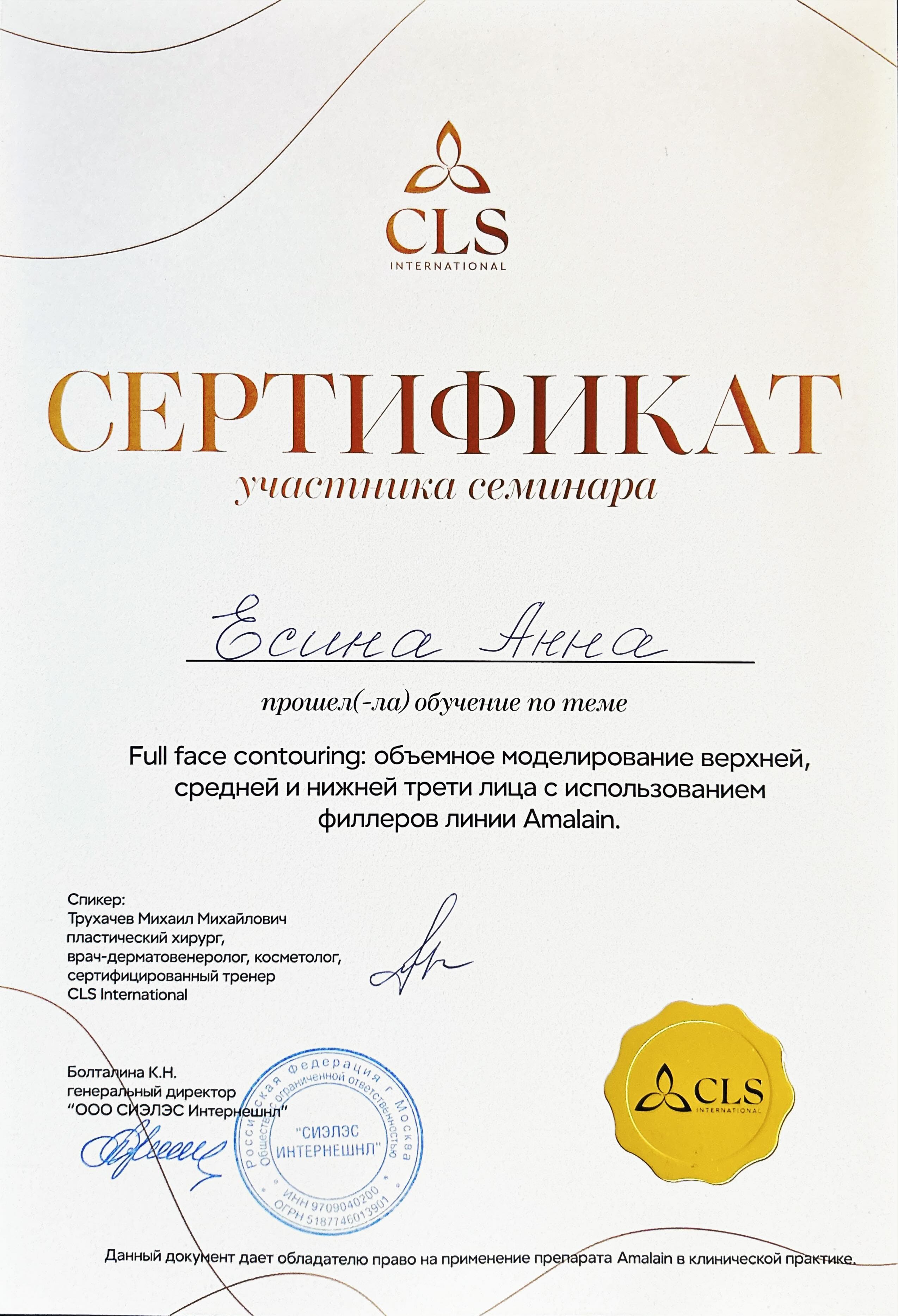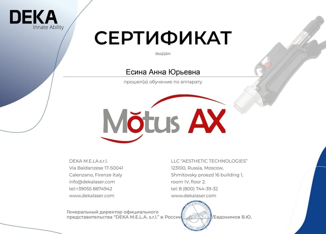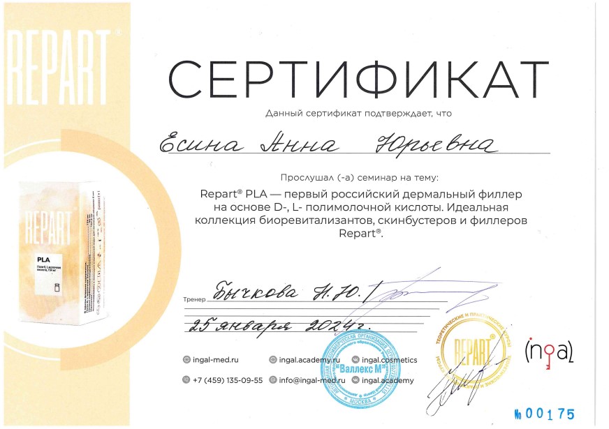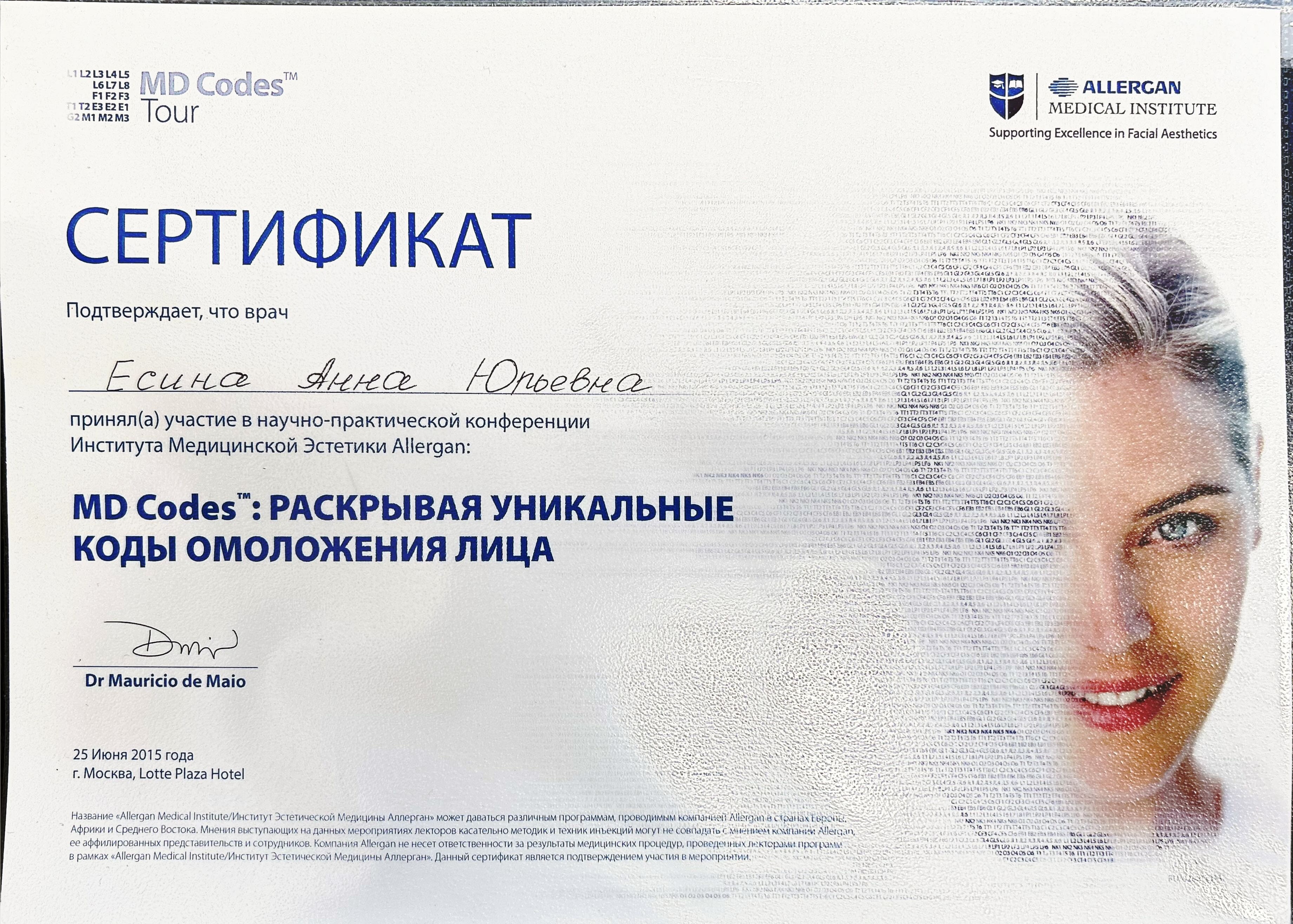 Сертификаты по окончанию теоретического и практического курса обучения на аппаратах: Diode lasers MeDioStar; «MCL 31 Dermablate Erbium Laser»