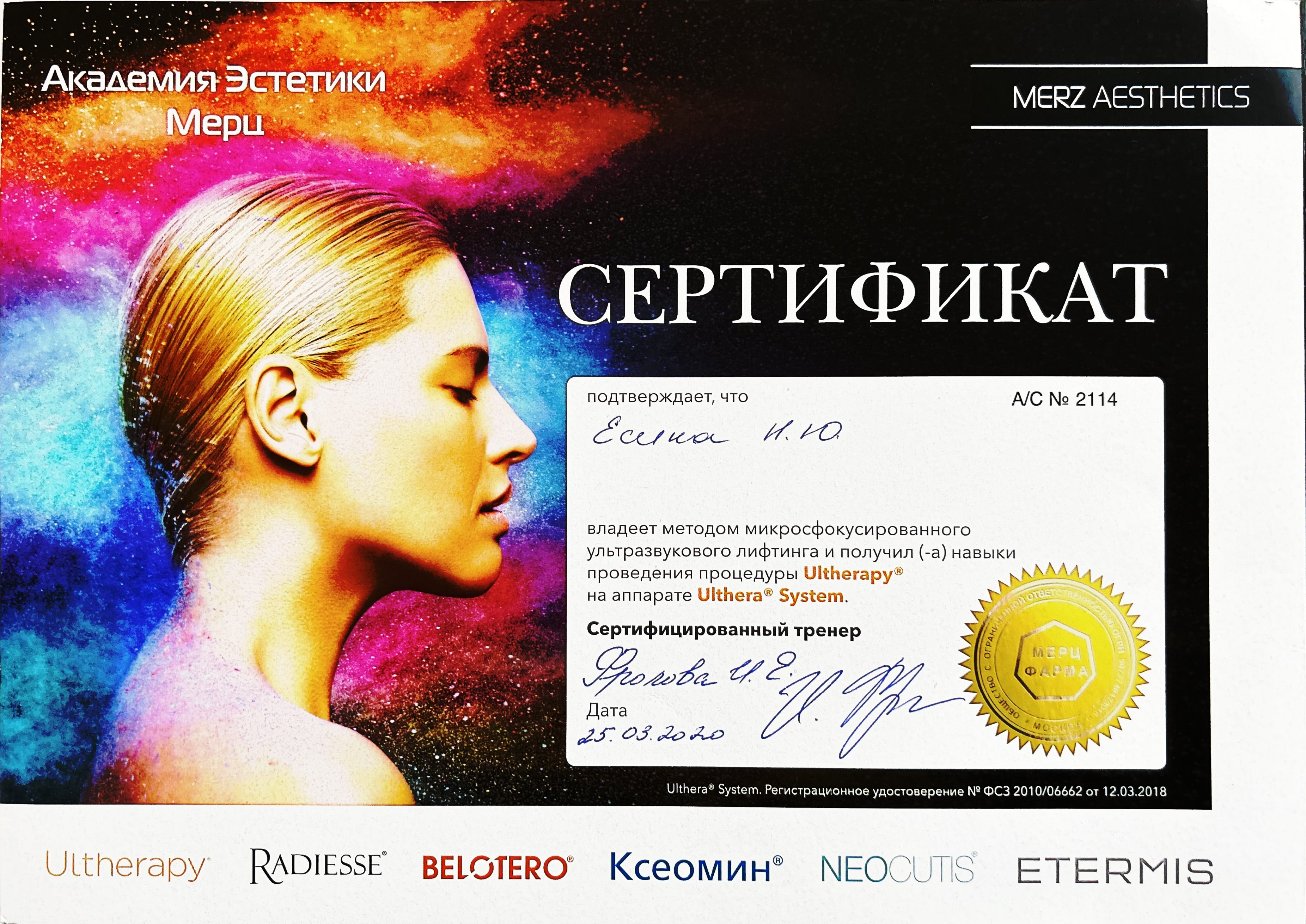 Сертификат на владение методом микросфокусисованного ультразвукового лифтинга на аппарате Ulthera System