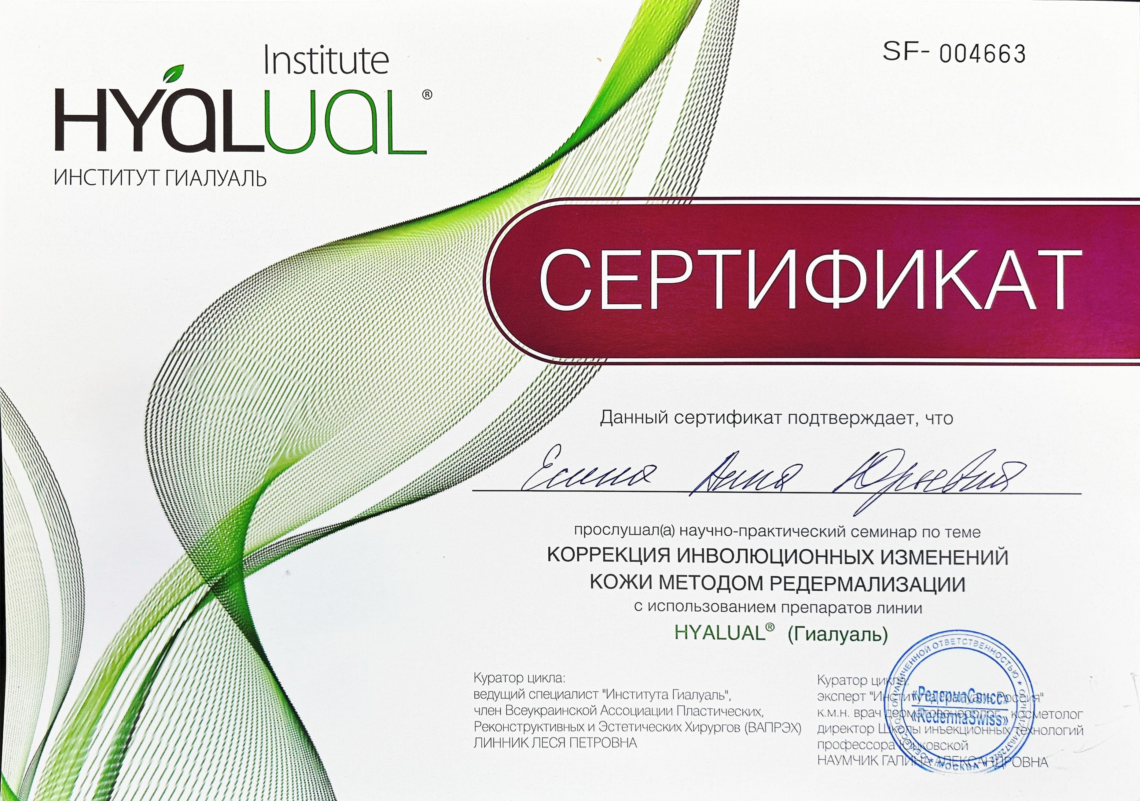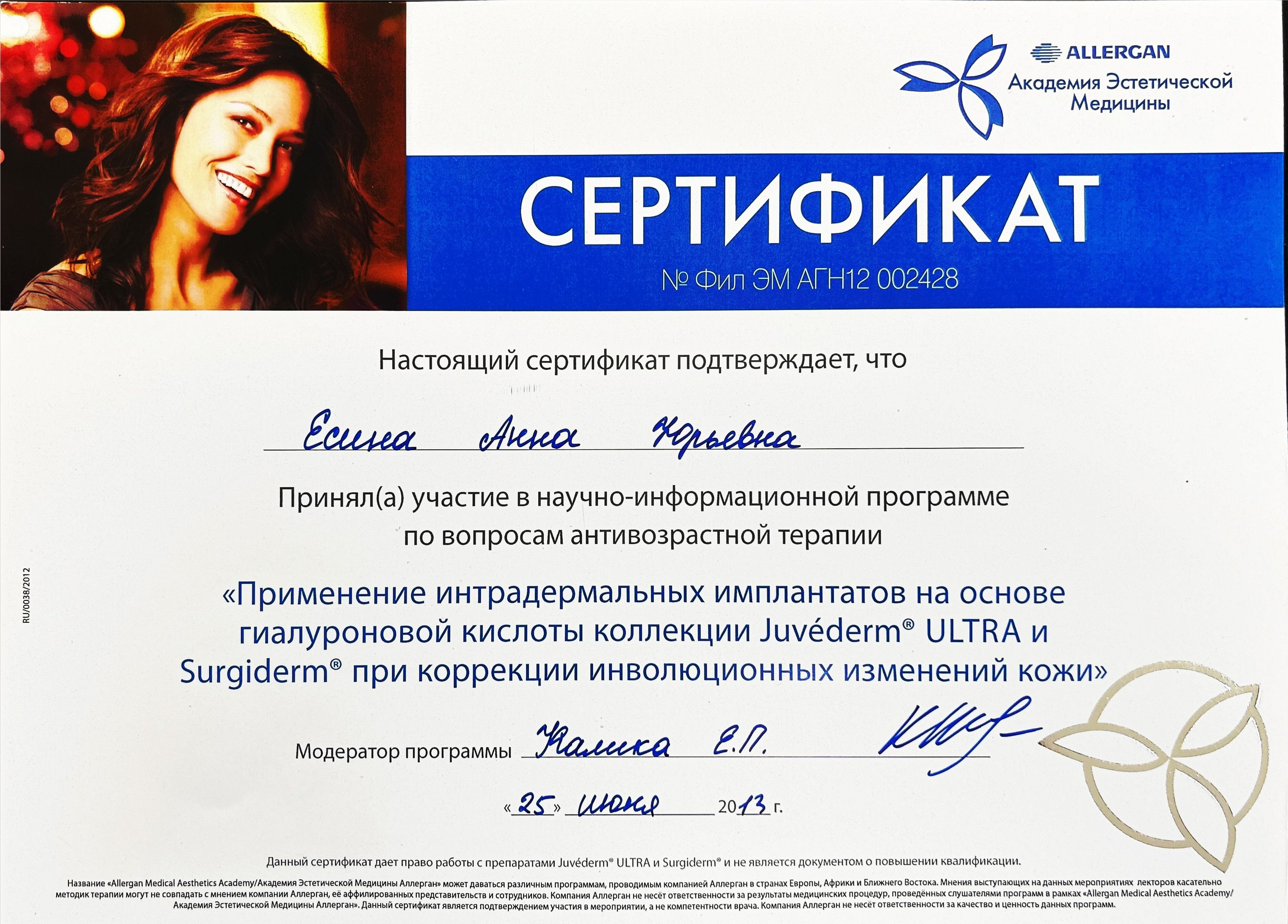 Сертификат по вопросам антивозрастной терапии «Применение интрадермальных имплантов на основе гиалуроновой кислоты препаратами Juvederm Ultra и Surgederm при коррекции инволюционных изменений кожи»