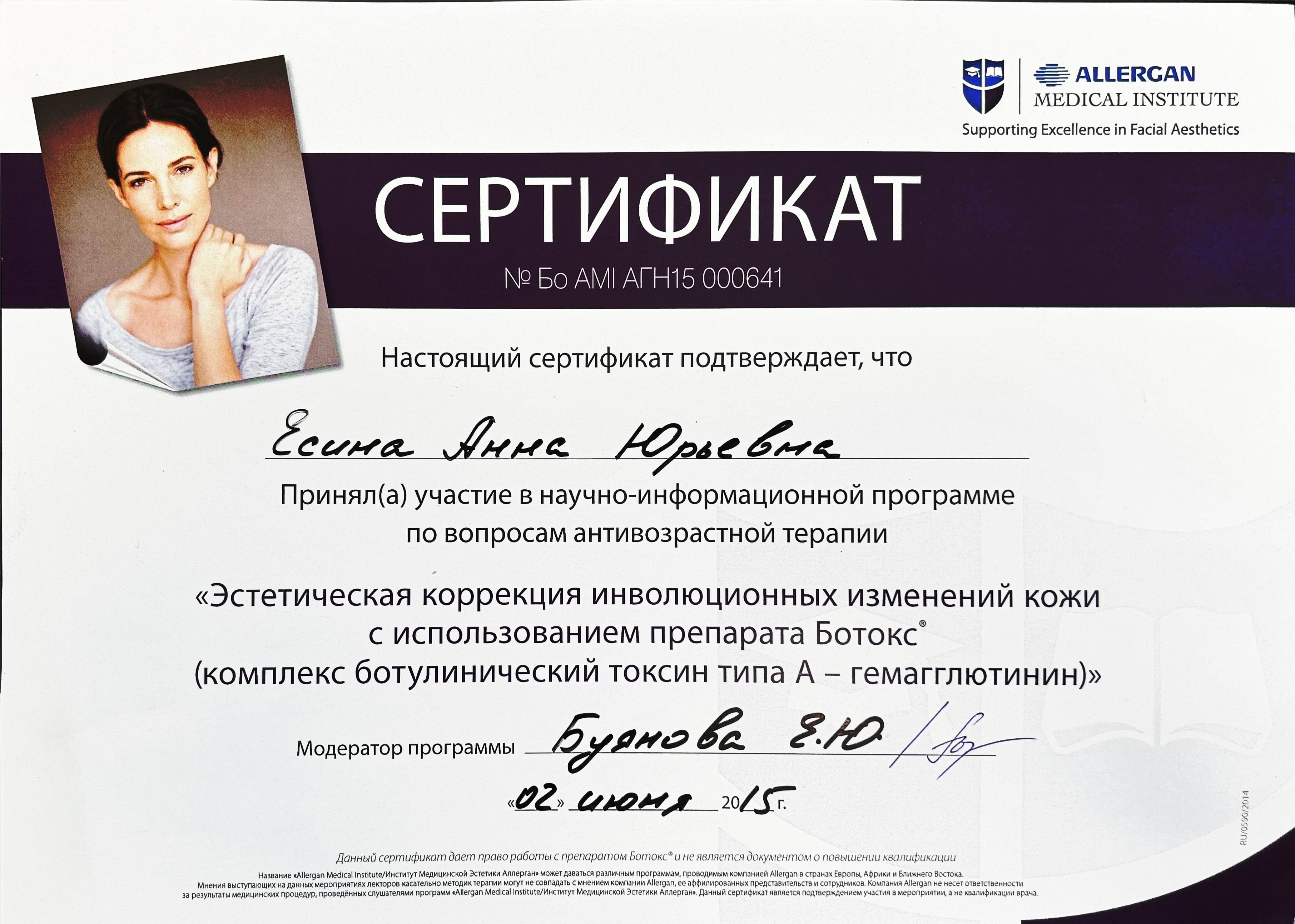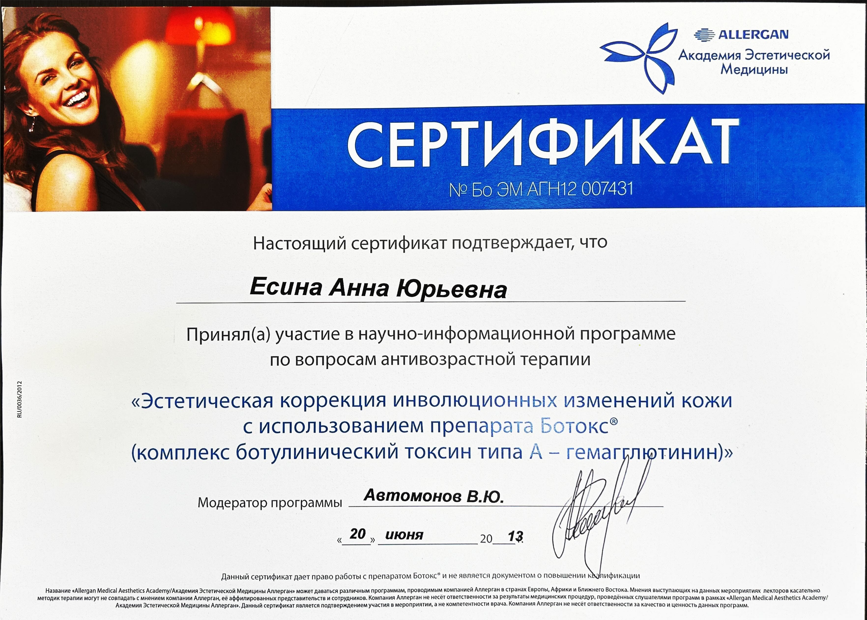 Диплом участника конференции "Применение препарата Ботокс в эстетической медицине".