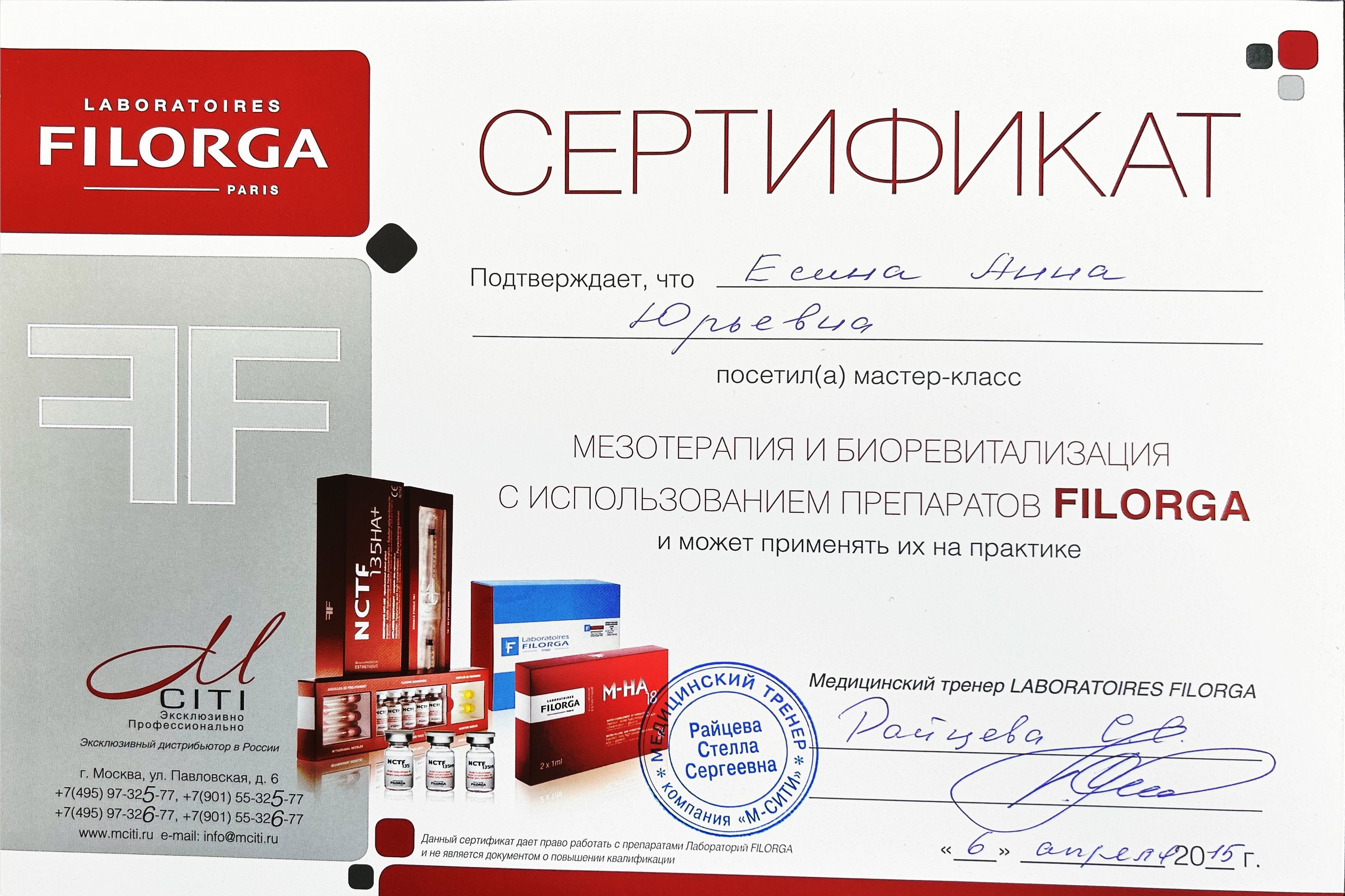 Сертификат по мезотерапии и биоревитализации с использованием препаратов Filorga