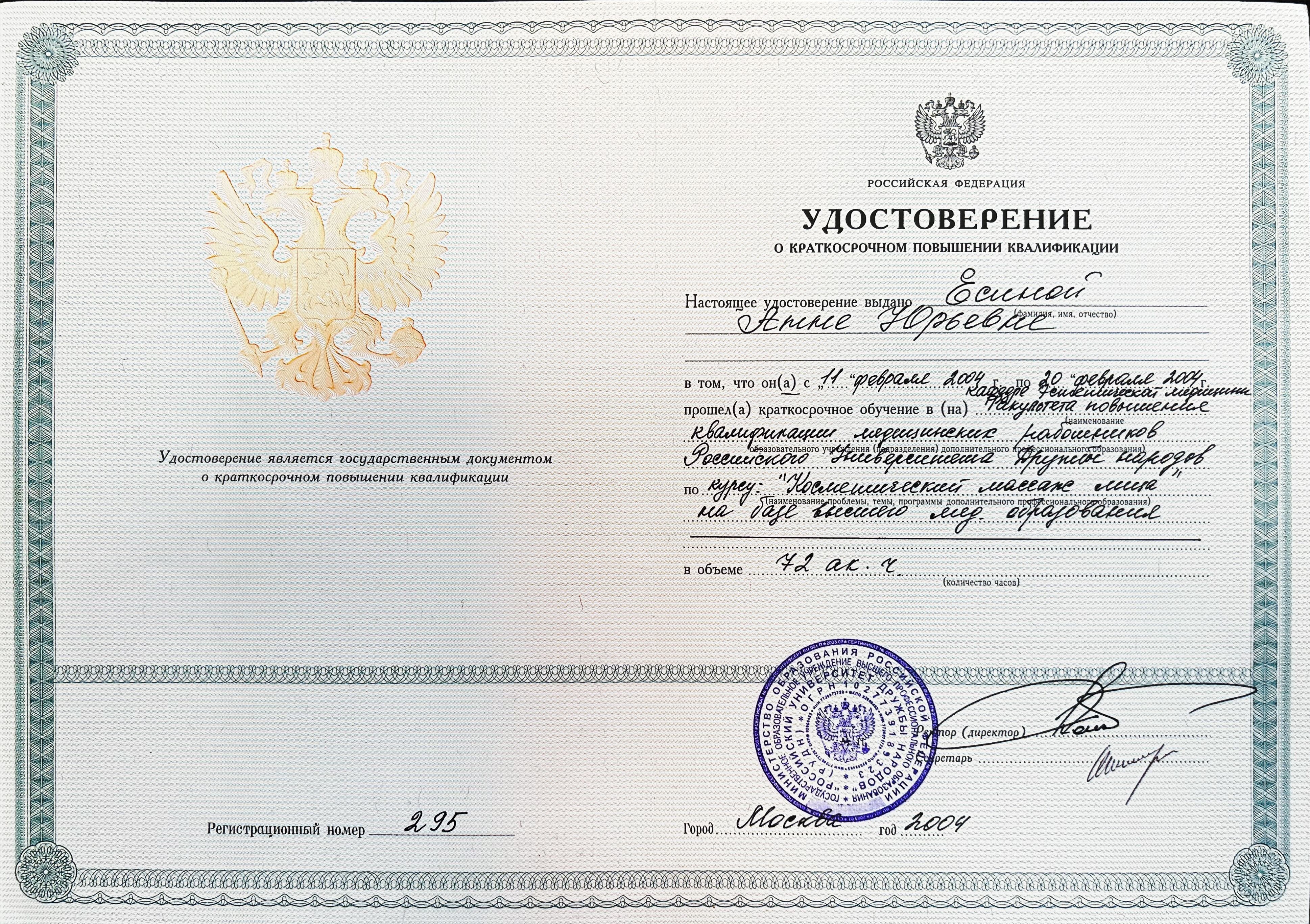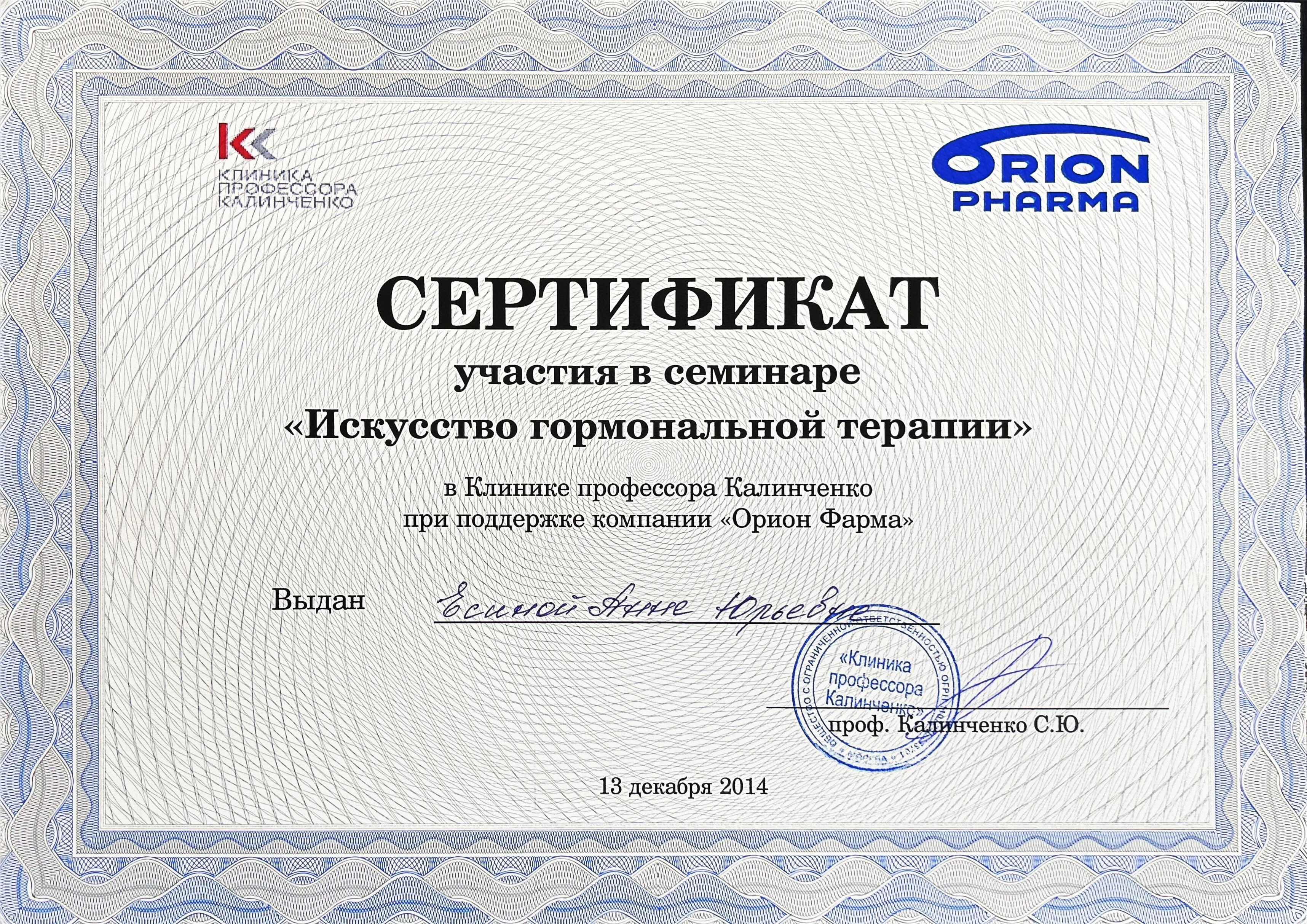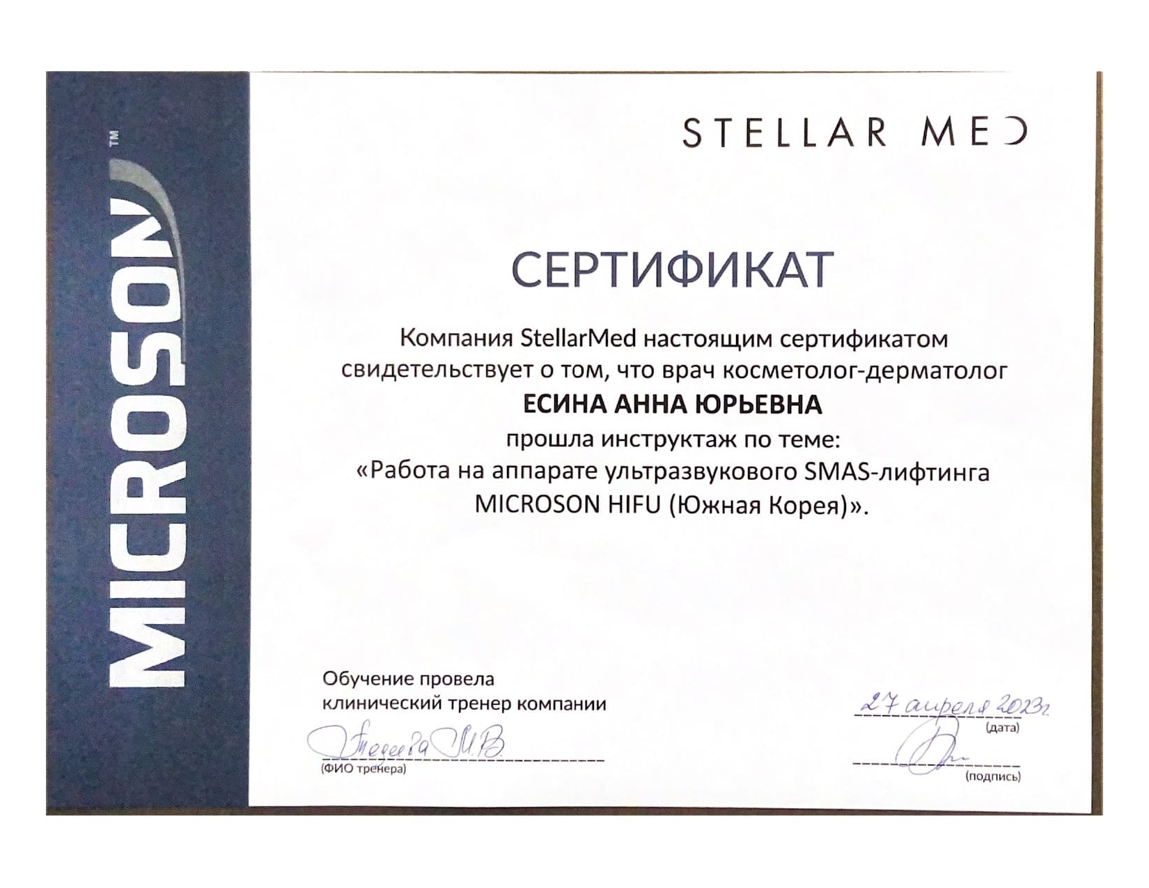 Сертификат по окончанию теоретического и практического курса обучения на аппарате