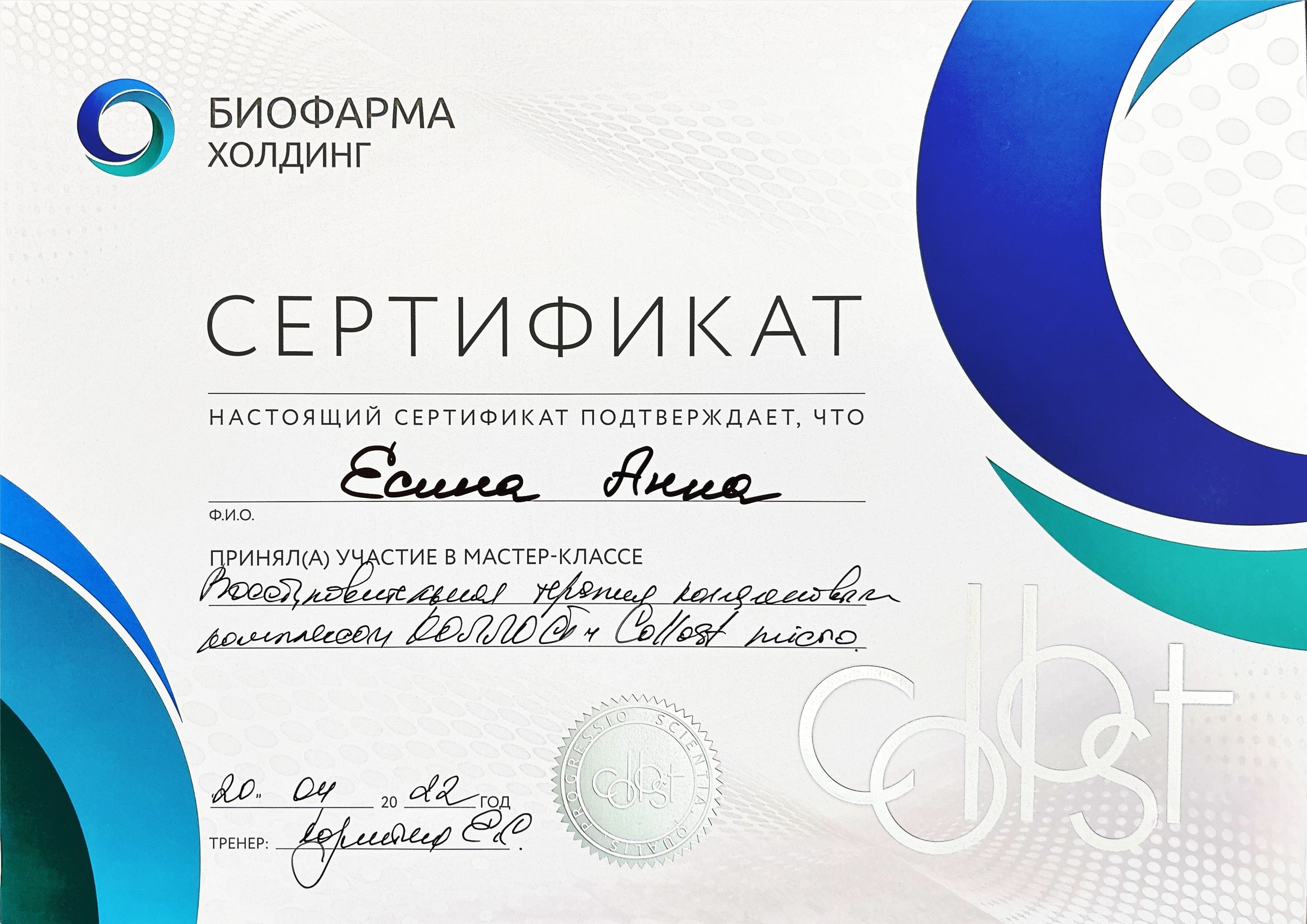 Сертификат по применению восстановительного коллагенового комплекса Коллост в дерматокосметологии