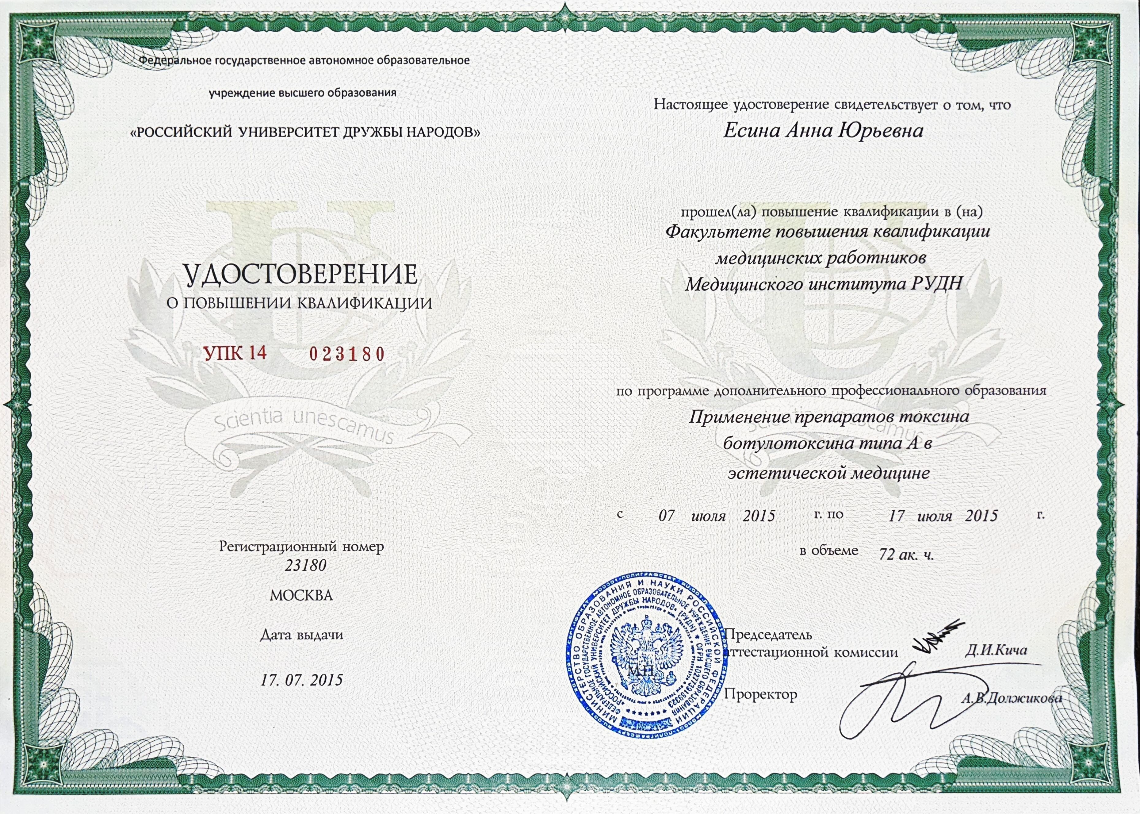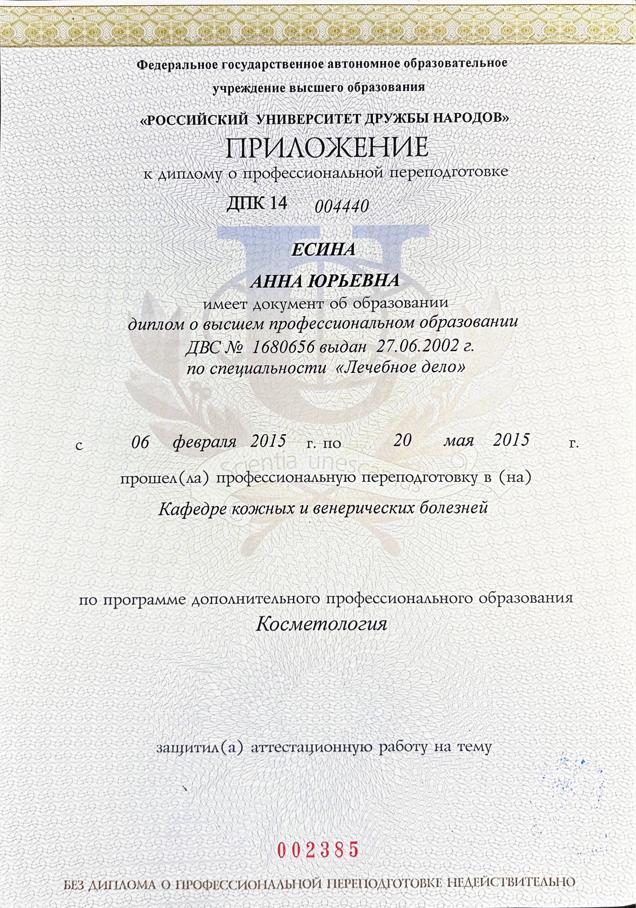 Повышение квалификации по теме: "Новейшие достижения в области дерматокосметологии" (576 часов) РУДН, Дерматовенерология