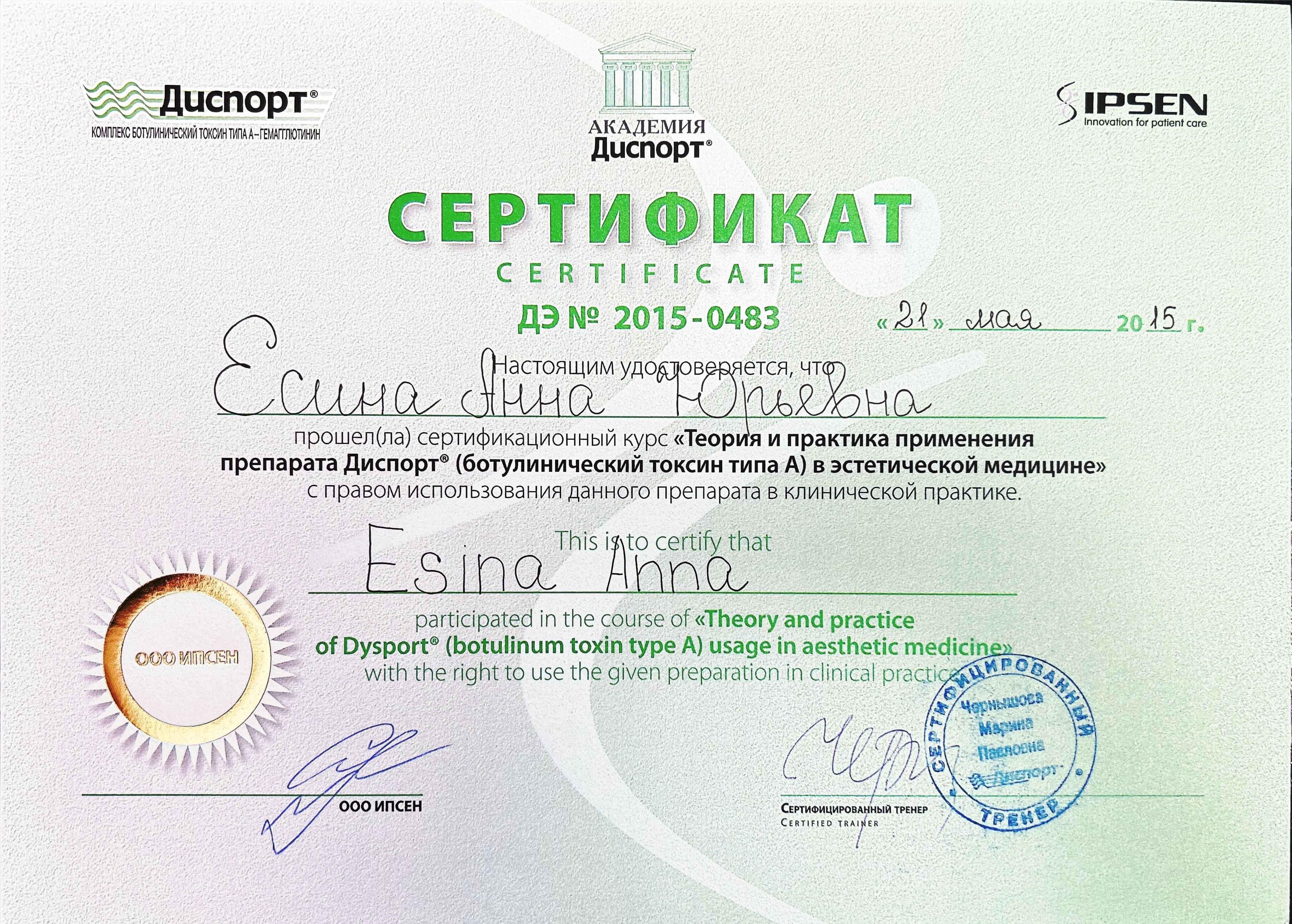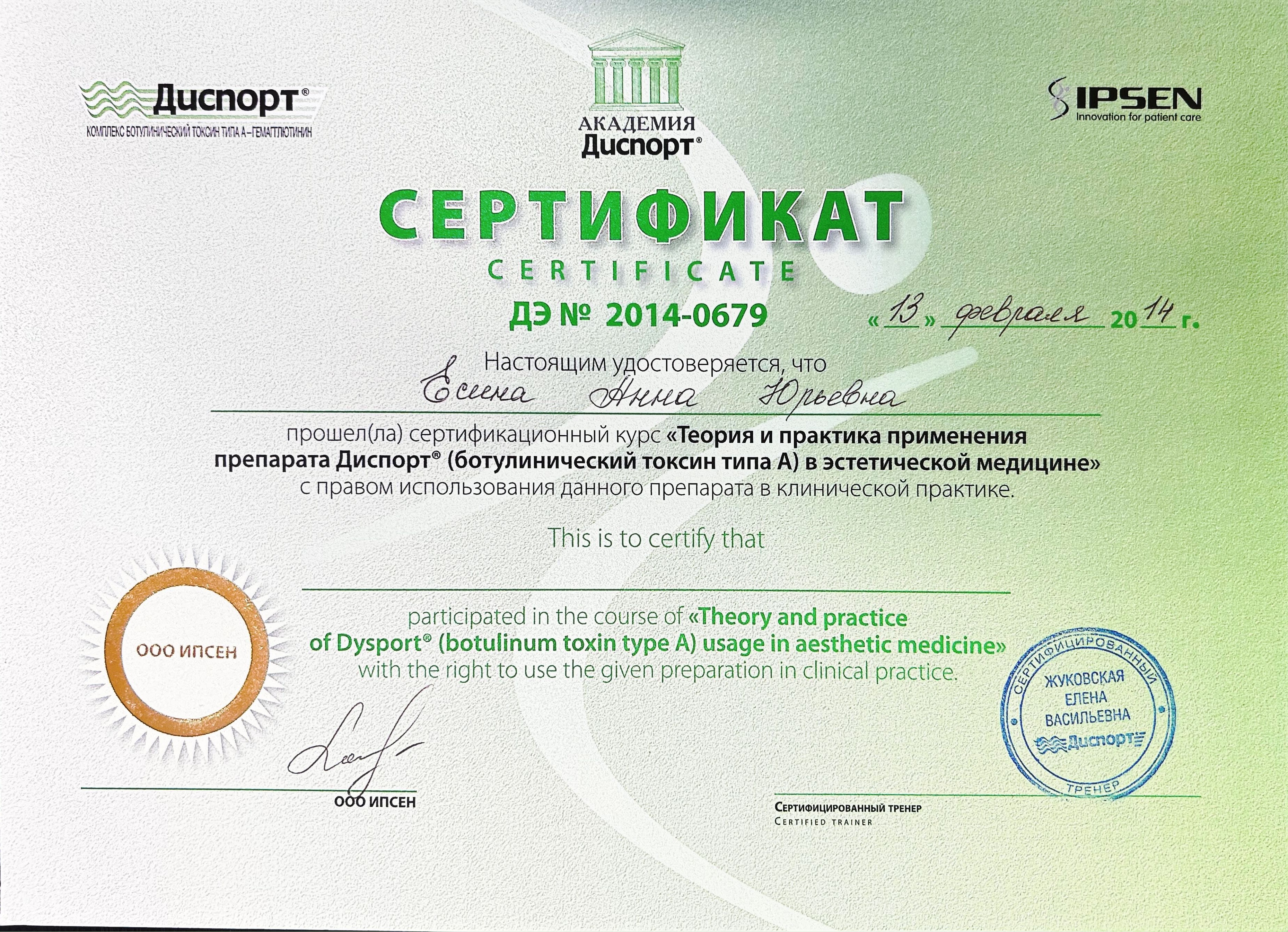 Диплом участника конференции "Применение препарата Диспорт в эстетической медицине"