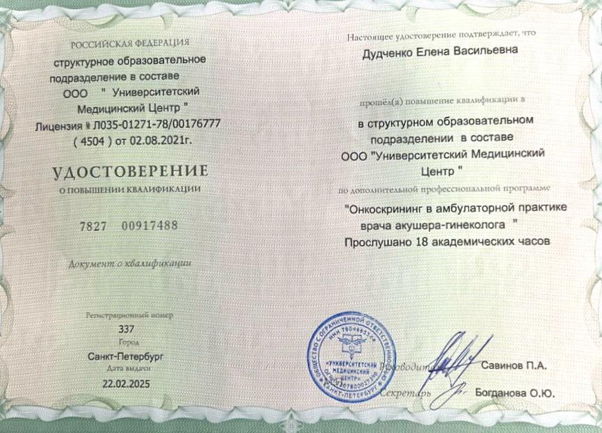 Диплом о профессиональной переподготовки по акушеству-гинекологии,