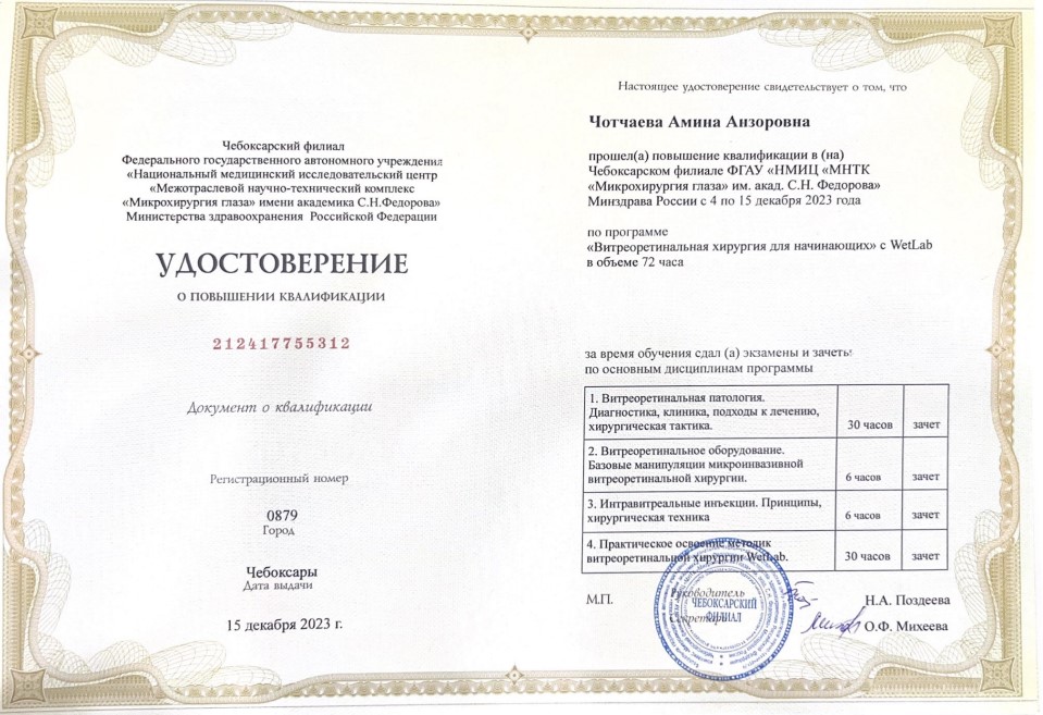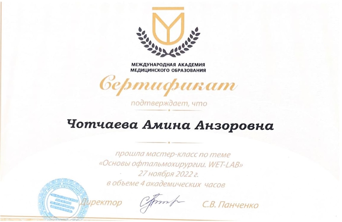 Хочу выразить искреннюю признательность и огромную благодарность лечащему врачу-офтальмохирургу Чотчаевой Амине Анзоровне. Обратилась к Амине Анзоровне со своим сложным диагнозом после лечения и проведения нескольких операций на глазах по месту... Читать далее