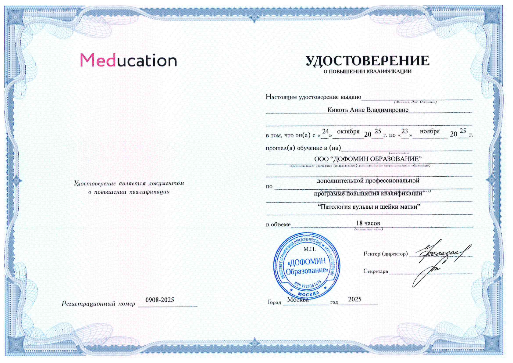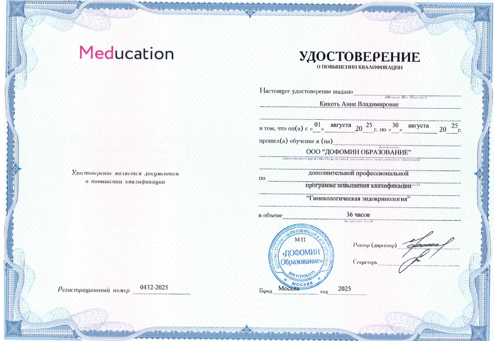 Давно наблюдаюсь у Кикоть Анны Владимировны. Анна Владимировна очень грамотный специалист и чуткий человек. Всегда внимательна, подробно и понятно объясняет все анализы и назначения, отвечает на все возникающие вопросы.