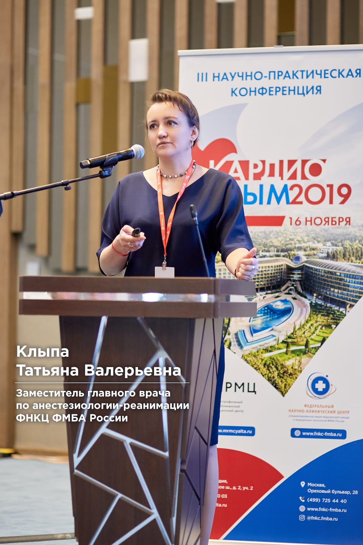 Клыпа Татьяна Валерьевна - Заместитель главного врача по анестезиологии-реанимации ФНКЦ ФМБА России. Заведующая кафедрой анестезиология и реаниматология Академии постдипломного образования ФГБУ ФНКЦ ФМБА России. Доктор медицинских наук. Врач высшей категории. Более 65 публикаций, из них 15 в журналах, рецензируемых ВАК.