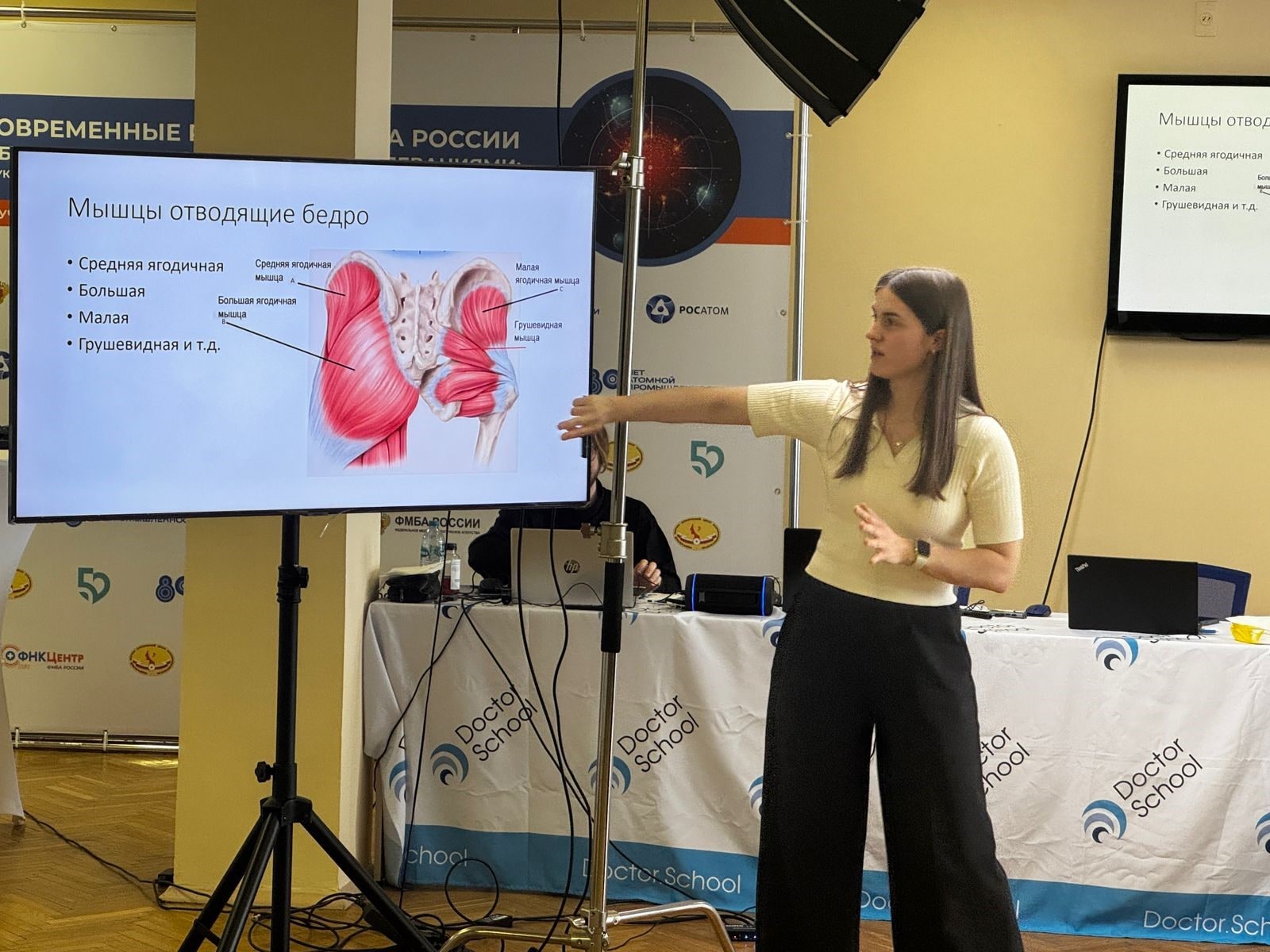 Врач по лечебной физкультуре и спортивной медицине Бекназарова Мария Петровна провела мастер-класс по коррекции и восстановлению биомеханики конечностей на тему «Алгоритм составления программы и плана реабилитации, кинезиотейпирование и средства разгрузки конечностей. Работа на модели с патологией опорно-двигательного аппарата. Аппаратная физиотерапия в травматологии и ортопедии».