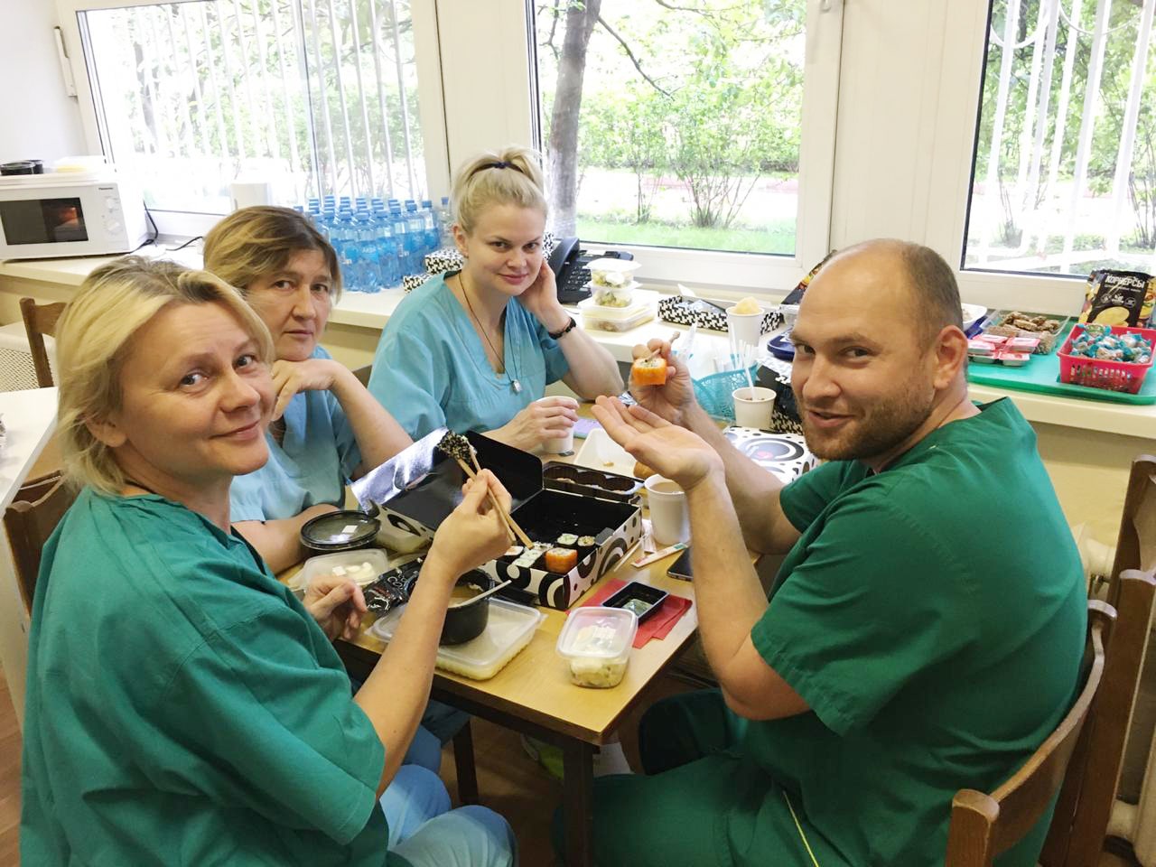 В меню доставки включены сеты из роллов. При этом во время приготовления и доставки соблюдаются все меры предосторожности. Персонал «Якитории» работает строго в масках и перчатках. Передача блюд в ФНКЦ осуществляется специально сформированной под данный проект группой доставки, бесконтактно, а значит любой риск распространения инфекции отсутствует.