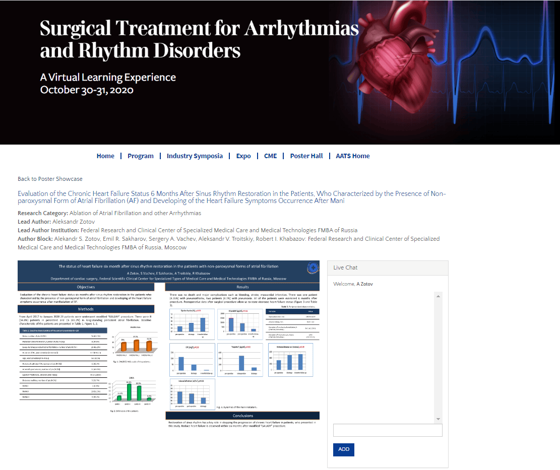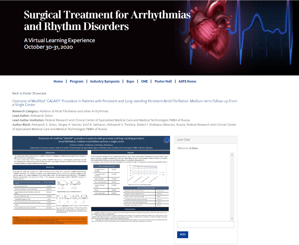 Заведующий отделением кардиохирургии Зотов Александр Александрович совместно со специалистами ФНКЦ ФМБА России опубликовали 3 доклада на конгрессе «Surgical Treatment for Arrhythmias»(Американская ассоциация кардиоторакальных хирургов).