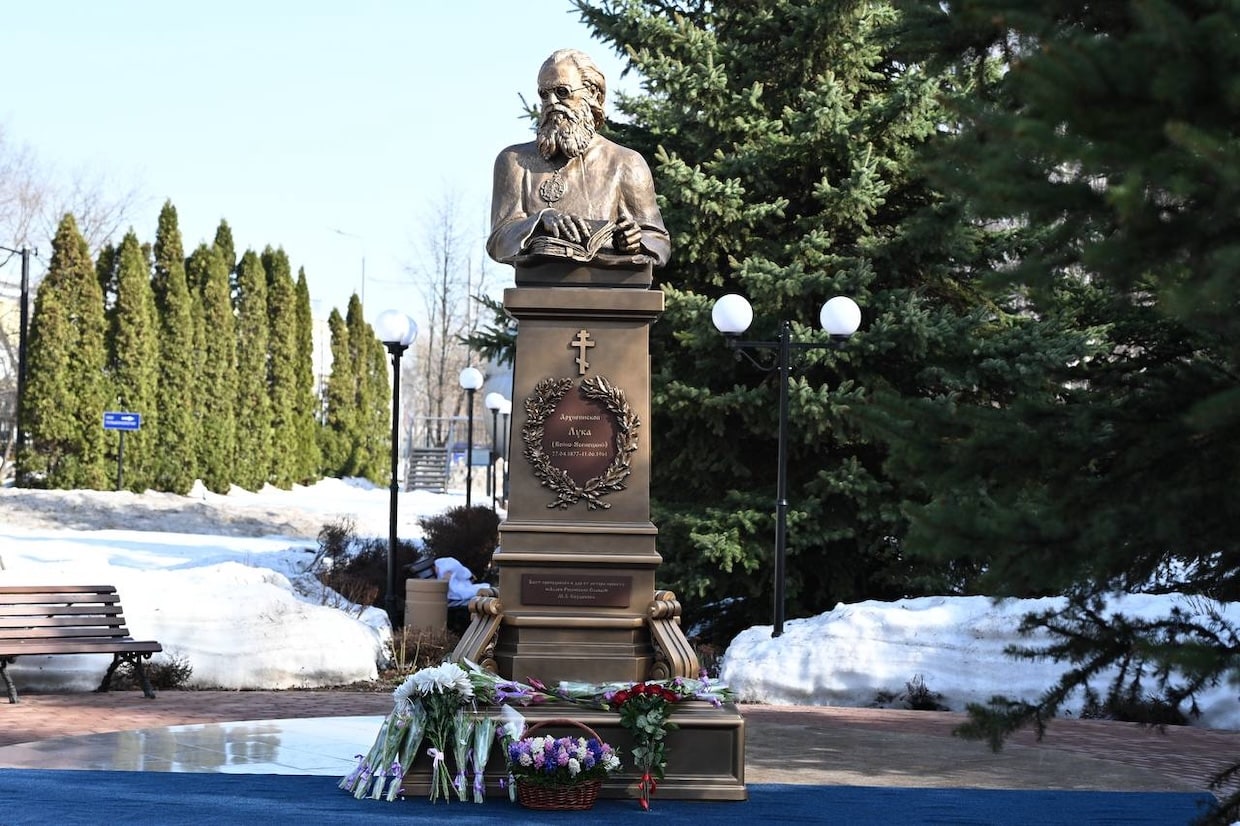 Святитель Лука — редкий пример человека, соединившего в себе два служения: архиерея и хирурга. Он входил в операционную после молитвы и видел во врачебном деле продолжение своего духовного призвания. Он прошел через репрессии, ссылки и две войны, сохранив верность своему призванию. Находясь в заключении, Войно-Ясенецкий мысленно написал «Очерки гнойной хирургии», а после освобождения перенес их на бумагу. К концу жизни он полностью ослеп, но продолжал принимать людей — лечил молитвой и словом. В 2000 году был канонизирован Русской православной церковью. Открытие памятника состоялось в преддверии 150-летия со дня рождения святого.