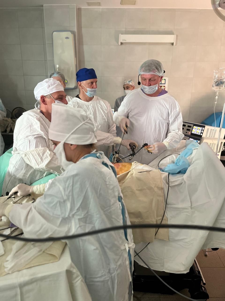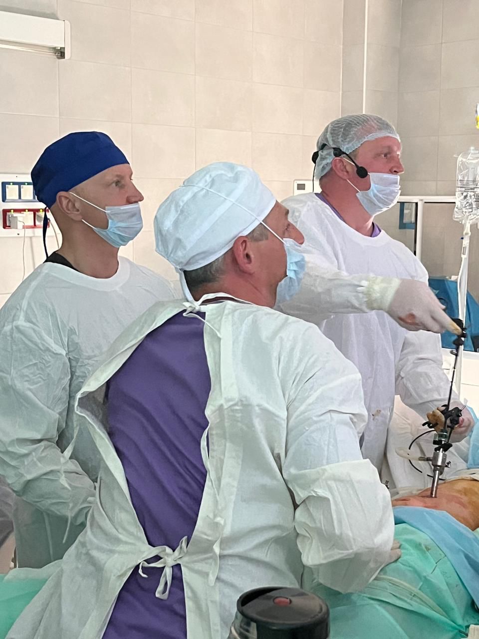 Также в режиме «живой хирургии» Санжаров А.Е. выполнил сложнейшую реконструктивно-восстановительную операцию «Лапароскопическая полная пластика мочеточника сегментом тонкой кишки» по поводу протяженной стриктуры и дисплазии мочеточника у молодой пациентки.