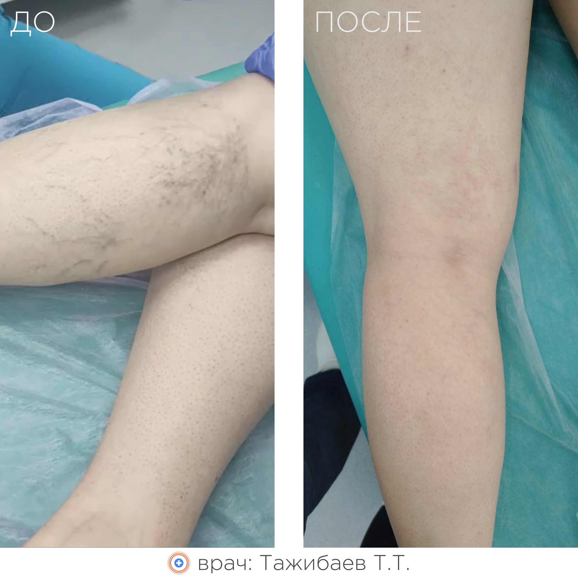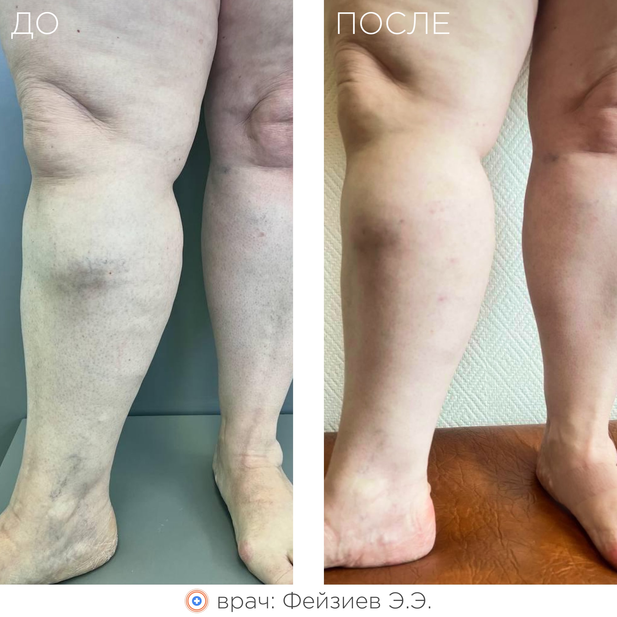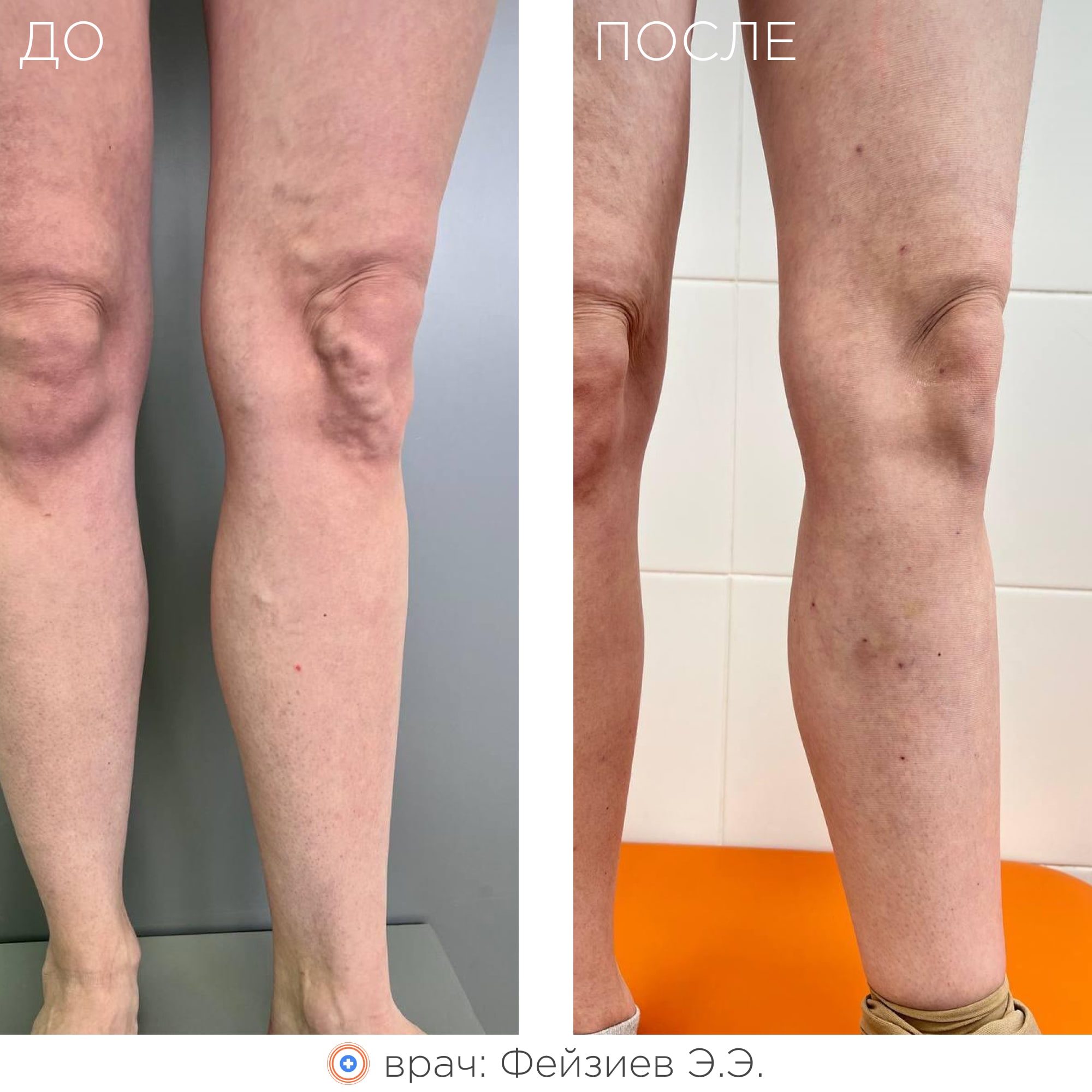 Следует помнить, что окончательный эстетический результат не достигается сразу после выполнения процедуры, эффективность можно оценивать спустя 4-6 недель или даже через 5-6 месяцев: это зависит от диаметра и объёма склерозированных вен.