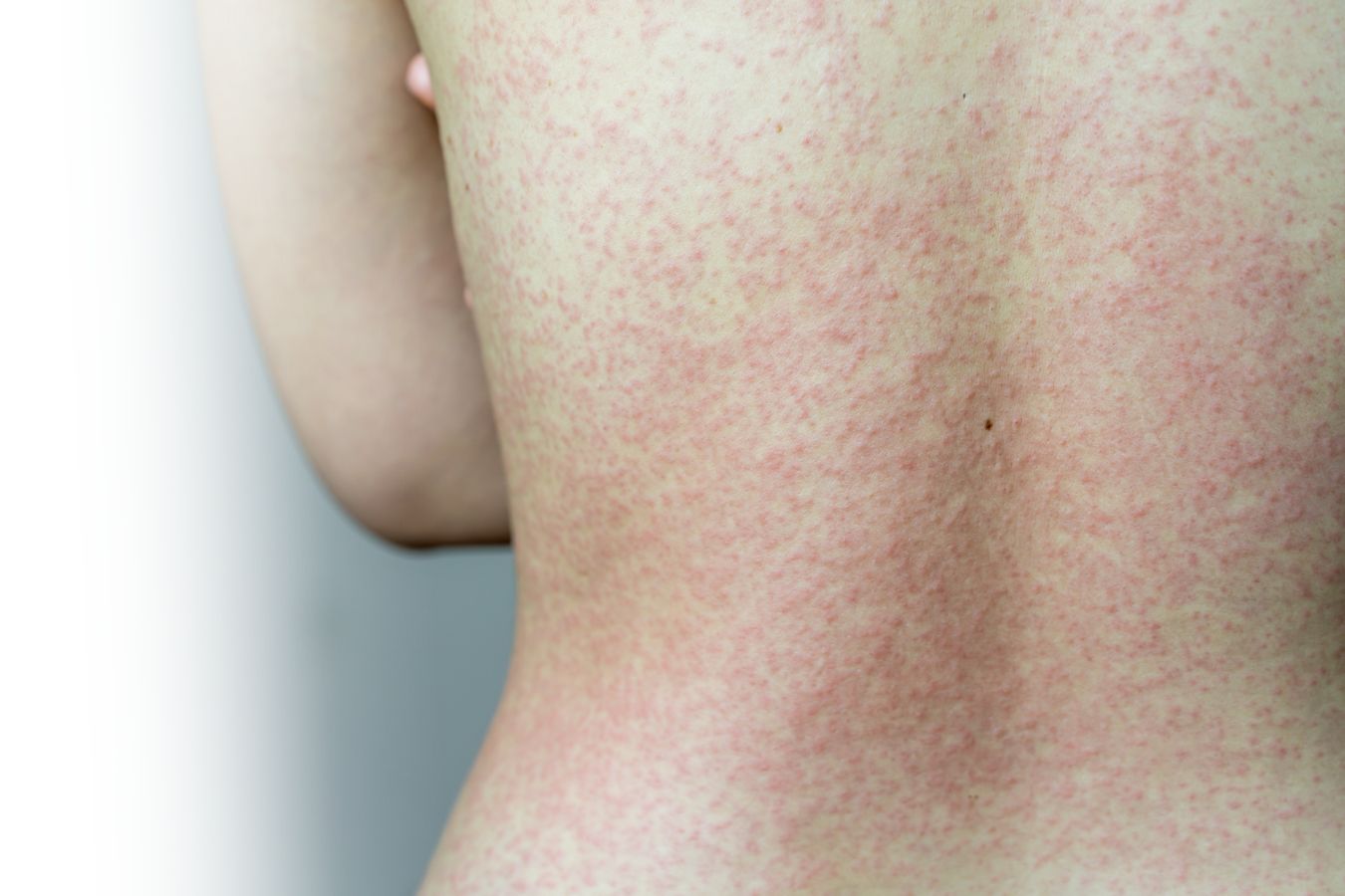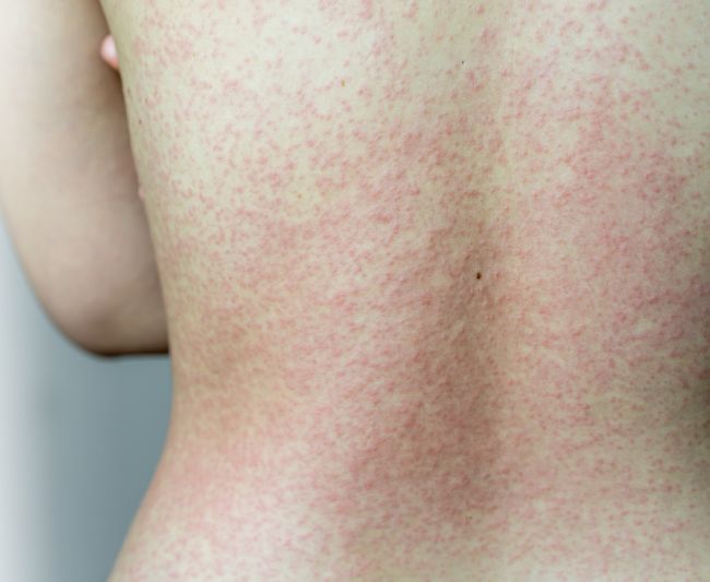 - Сыпь розового или лососёвого оттенка, которая представлена плоскими пятнами или узелками. Она появляется на коже рук, ног, тела в местах повреждений, на фоне лихорадки. Нередко высыпания исчезают сразу после снижения температуры.
