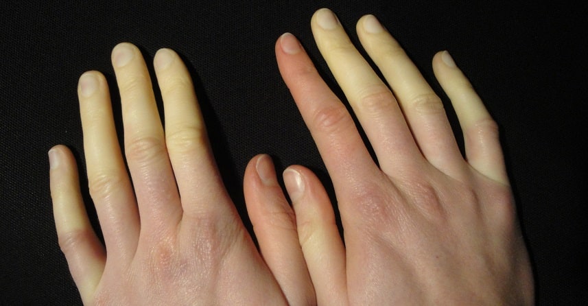 Синдром Рейно представлен кратковременными эпизодами изменения цвета кожи пальцев кистей и стоп в ответ на низкую температуру окружающей среды, контакт с холодными предметами, стрессовые события. Сосудистая реакция может затрагивать область носа, губ и ушей. Описанные изменения происходят на фоне нарушения тонуса стенки кровеносных сосудов и называются атаками Рейно.